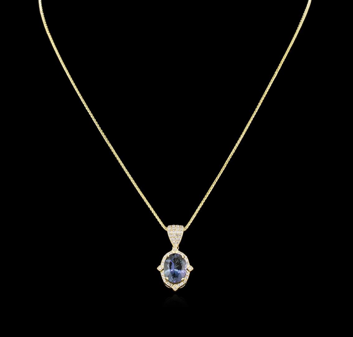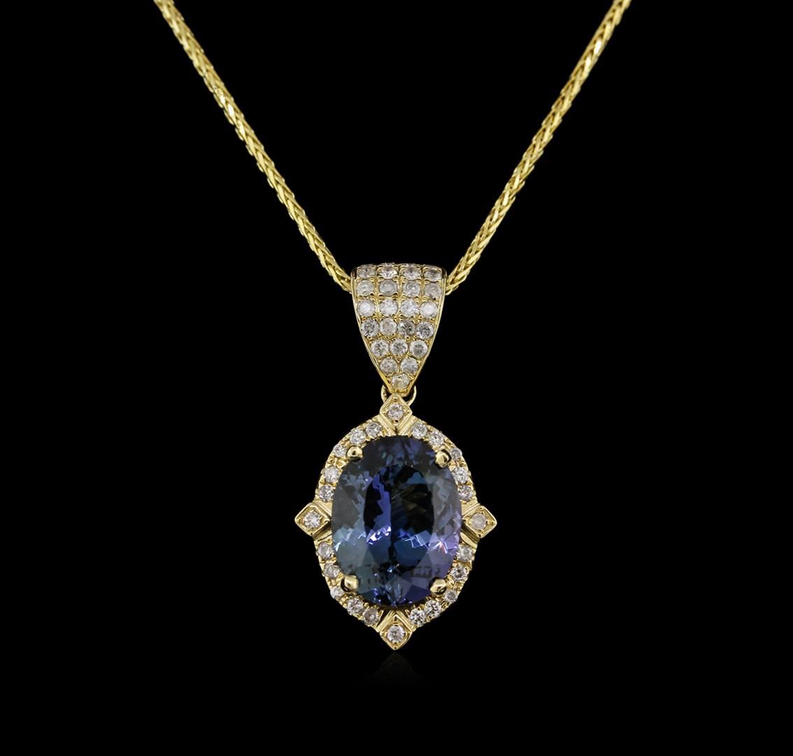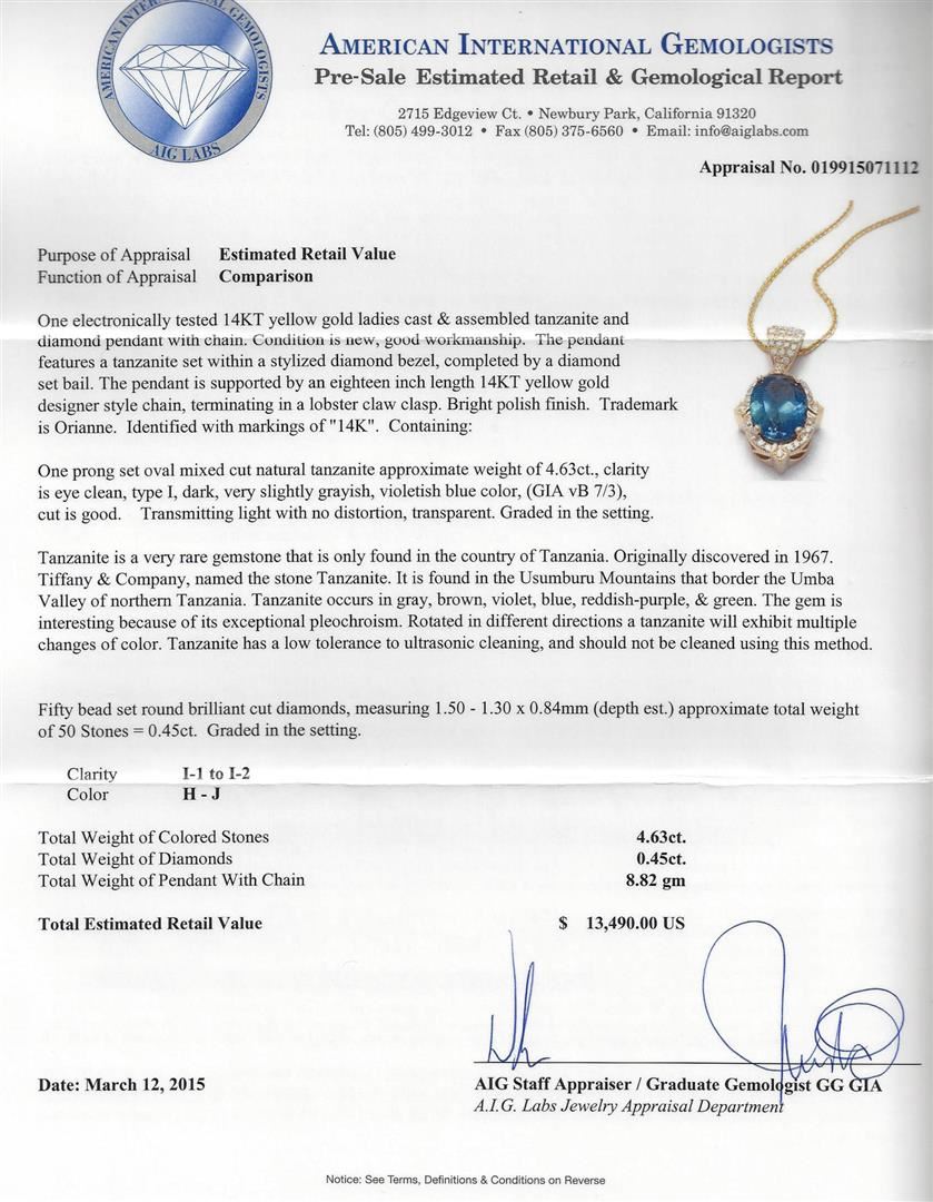 One electronically tested yellow gold ladies cast & assembled tanzanite and diamond pendant with chain. Condition is new, good workmanship. The pendant features a tanzanite set within a stylized diamond bezel, completed by a diamond set bail. The pendant is supported by an eighteen inch length yellow gold designer style chain, terminating in a lobster claw clasp. Bright polish finish. Trademark is Orianne. Identified with markings of "14K".Containing:One prong set oval mixed cut natural tanzanite approximate weight of 4.63ct., clarity is eye clean, type I, dark, very slightly grayish, violetish blue color, (GIA vB 7/3), cut is good. Transmitting light with no distortion, transparent. Graded in the setting. Tanzanite is a very rare gemstone that is only found in the country of Tanzania. Originally discovered in 1967.Tiffany & Company, named the stone Tanzanite. It is found in the Usumburu Mountains that border the UmbaValley of northern Tanzania. Tanzanite occurs in gray, brown, violet, blue, reddish-purple, & green. The gem is interesting because of its exceptional pleochroism. Rotated in different directions a tanzanite will exhibit multiple changes of color. Tanzanite has a low tolerance to ultrasonic cleaning, and should not be cleaned using this method. Fifty bead set round brilliant cut diamonds, measuring 1.50 - 1.30 x 0.84mm (depth est.) approximate total weight of 50 Stones = 0.45ct. Graded in the setting. Clarity: I-1 to I-2. Color: H - J. AIG Appraised at $13,490.00.