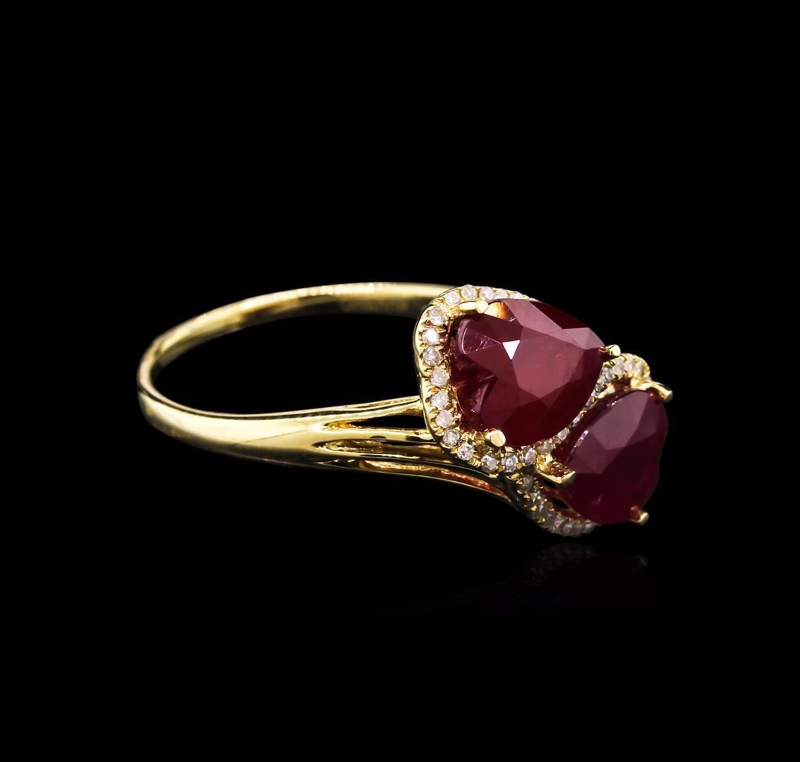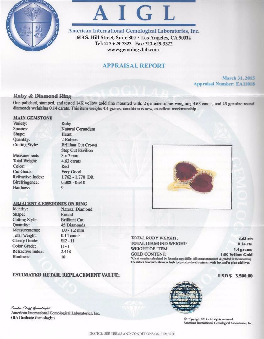 One polished, stamped, and tested 14K yellow gold ring mounted with: 2 genuine rubies weighing 4.63 carats, and 45 genuine round diamonds weighing 0.14 carats. This item weighs 4.4 grams, condition is new, excellent workmanship. Main Gemstone: Variety: Ruby. Species: Natural Corundum. Shape: Heart. Quantity: 2 Rubies. Cutting Style: Brilliant Cut Crown Step Cut Pavilion. Measurements: 8 x 7 mm. Total Weight: 4.63 carat. Color: Red. Cut Grade: Very Good. Refractive Index: 1.762 - 1.770 DR. Birefringence: 0.008 - 0.010. Hardness: 9. Adjacent Gemstones On Ring: Identity: Natural Diamond. Shape: Round. Cutting Style: Brilliant Cut. Quantity: 45 Diamonds. Measurements: 1.0 -1.2 mm. Total Weight: 0.14 carats. Clarity Grade: SI2-II. Color Grade: H- I. Refractive Index: 2.418. Hardness 10. Total Ruby Weight: 4.63cts. Total Diamond Weight: 0.14cts. Weight Of Item: 4.4 grams. Gold Content: 14K Yellow Gold. AIGL Appraised at $3,500.00.