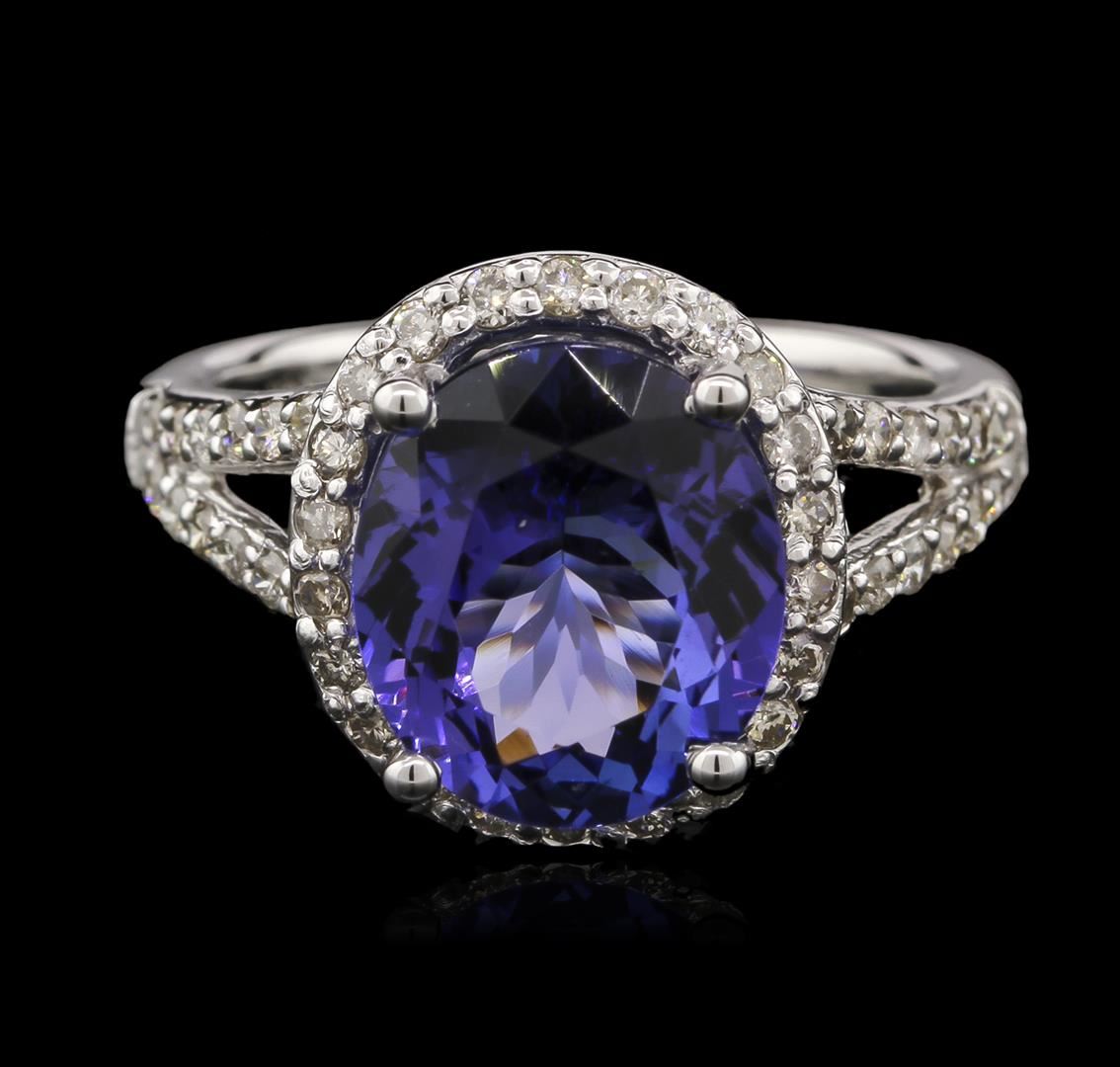 One electronically tested 14KT white gold ladies cast tanzanite and diamond ring with a bright polish finish. Identified with markings of "14K". Condition is new. Containing: One prong set oval modified brilliant cut natural tanzanite, measuring 10.70 x 10.10 x 6.10mm, approximate weight of 4.64ct., clarity is eye clean, type I, medium, moderately strong, bluish violet color, (GIA bV 5/4), cut is good. Fifty prong set round brilliant cut diamonds, measuring 1.50 - 1.50 x 0.90mm (depth est.) approximate. Total Weight of 50 Stones = 0.62ct. Clarity: SI-1 to SI-2. Color: H - I, Cut is Good. Colored gemstones are presumed to have been subjected to commonly used enhancement processes. All diamonds and colored gemstones are graded in the mounting, unless otherwise stated. Total Weight of Colored Stones 4.64ct. Total Weight of Diamonds 0.62ct. Total Weight of Ring 5.90 grams. GGL Appraised at $4,215.00.