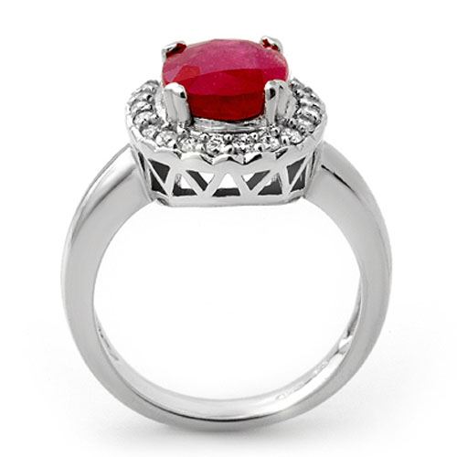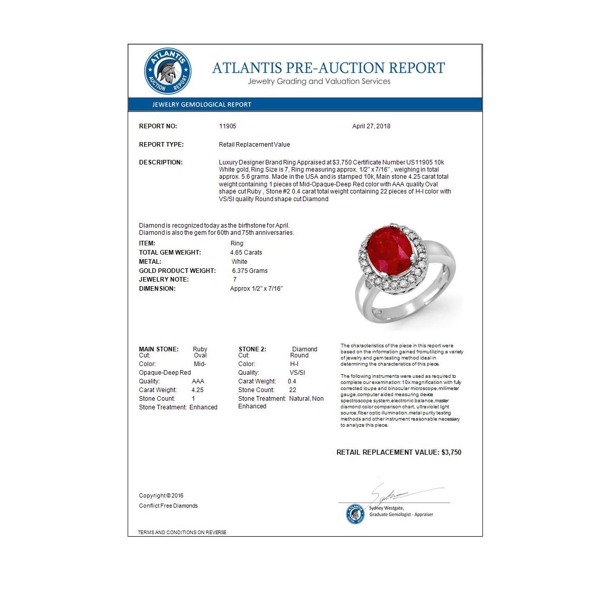 REF-52W2F -11905 ---- 4.65 CTW Ruby & Diamond Ring 10K White Gold ---- Luxury Designer Brand Ring Appraised at $3,750 Certificate Number US11905 10k White gold, Ring Size is 7, Ring measuring approx. 1/2" x 7/16" , weighing in total approx. 5.6 grams. Made in the USA and is stamped 10k, Main stone 4.25 carat total weight containing 1 pieces of Mid-Opaque-Deep Red color with AAA quality Oval shape cut Ruby , Stone #2 0.4 carat total weight containing 22 pieces of H-I color with VS/SI quality Round shape cut Diamond
