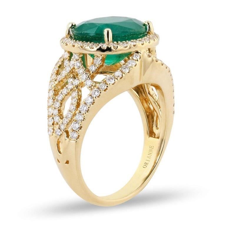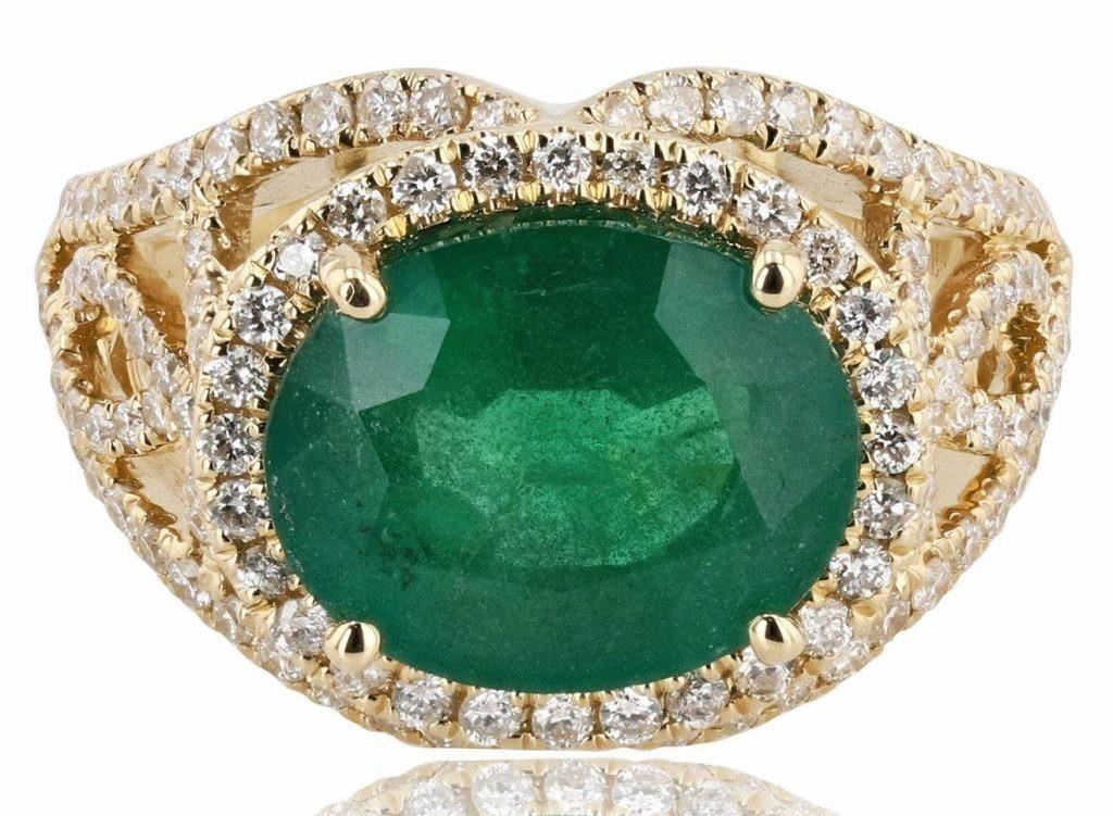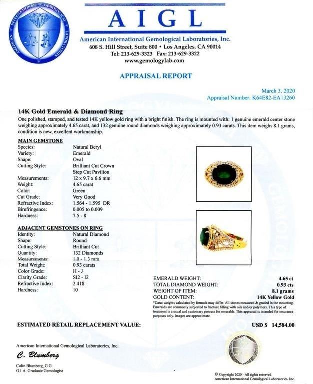 14K Gold Emerald & Diamond Ring One polished, stamped, and tested 14K yellow gold ring with a bright finish. The ring is mounted with: 1 genuine emerald center stone weighing approximately 4.65 carat, and 132 genuine round diamonds weighing approximately 0.93 carats. This item weighs 8.1 grams, condition is new, excellent workmanship. MAIN GEMSTONE Species: Natural Beryl Variety: Emerald Shape: Oval Cutting Style: Brilliant Cut Crown Step Cut Pavilion Measurements: 12 x 9.7 x 6.6mm Weight: 4.65 carat Color: Green Cut Grade: Very Good Refractive Index: 1.564 - 1.595 DR Birefringence: 0.005 to 0.009 Hardness: 7.5 - 8 ADJACENT GEMSTONES ON RING Identity: Natural Diamond Shape: Round Cutting Style: Brilliant Cut Quantity: 132 Diamonds Measurements: 1.0 - 1.3mm Total Weight: 0.93 carats Color Grade: H - J Clarity Grade: SI2 to I2 Refractive Index: 2.418 Hardness: 10 EMERALD WEIGHT: 4.65ct TOTAL DIAMOND WEIGHT: 0.93ctw