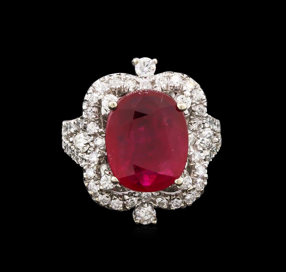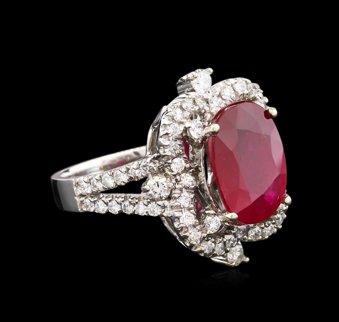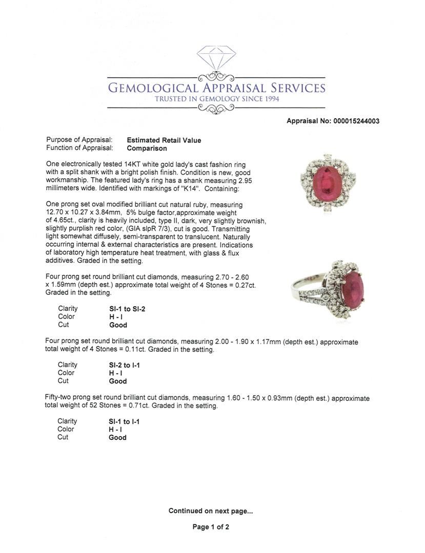 One electronically tested 14KT white gold lady's cast fashion ring with a split shank with a bright polish finish. The featured lady's ring has a shank measuring 2.95 millimeters wide. Identified with markings of "K14". Condition is new, good workmanship. Containing: One prong set oval modified brilliant cut natural ruby, measuring 12.70 x 10.27 x 3.84mm, 5% bulge factor, approximate weight of 4.65ct., clarity is heavily included, type II, dark, very slightly brownish, slightly purplish red color, (GIA slpR 7/3), cut is good. Transmitting light somewhat diffusely, semi-transparent to translucent. Naturally occurring internal & external characteristics are present. Indications of laboratory high temperature heat treatment, with glass & flux additives. Graded in the setting. Four prong set round brilliant cut diamonds, measuring 2.70 - 2.60 x 1.59mm (depth est.) approximate total weight of 4 Stones = 0.27ct. Graded in the setting. Clarity: SI-1 to SI-2. Color: H - I. Cut Good Four prong set round brilliant cut diamonds, measuring 2.00 - 1.90 x 1.17mm (depth est.) approximate total weight of 4 Stones = 0.11ct. Graded in the setting. Clarity: SI-2 to I-1. Color: H - I. Cut Good Fifty-Two prong set round brilliant cut diamonds, measuring 1.60 - 1.50 x 0.93mm (depth est.) approximate total weight of 52 Stones = 0.71ct. Graded in the setting. Clarity: SI-1 to I-1. Color: H - I. Cut Good. Total Weight of Colored Stones 4.65ct. Total Weight of Diamonds 1.09ct. Total Weight of Ring 8.50gm. GAS Appraised at $5,940.00.