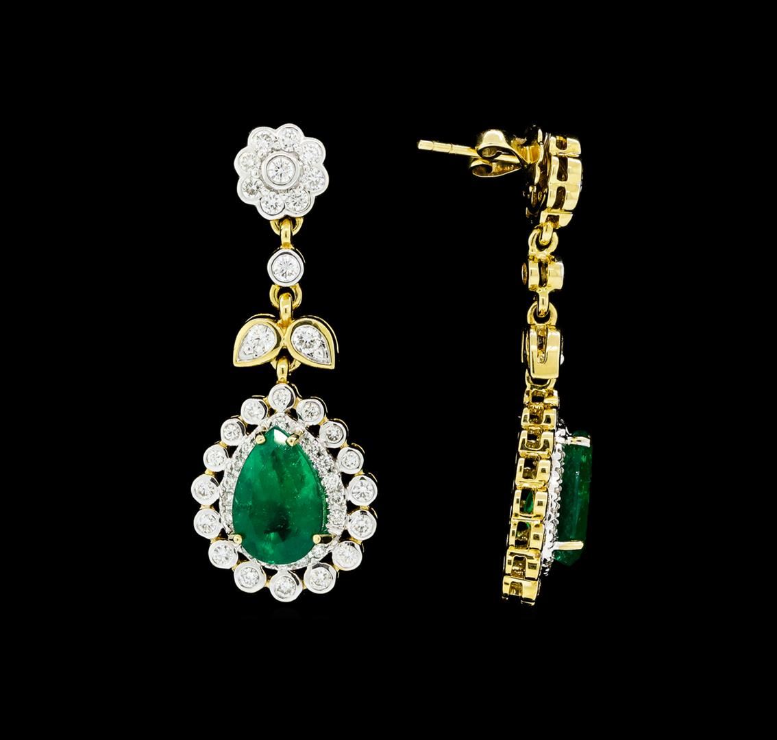 One pair electronically tested 18KT yellow with rhodium plating gold lady's combination cast & assembled fashion dangle earrings with heavy friction backs with a bright polish finish. The featured lady's earrings have a drop of approximately 37 millimeters. Identified with markings of '18K'. Condition is new, good workmanship. Containing: Two prong set pear modified brilliant cut natural emeralds, measuring 10.70 x 7.05 x 5.54mm, (depth est.) approximate total weight of 4.66ct., clarity is heavily included, medium dark, strong, very slightly bluish green color, (GIA vslbG 6/5), cut is good. The featured emeralds are Columbian in origin. Naturally occurring internal & external characteristics are present. Indications of oil residue. Colored gemstones are presumed to have been subjected to commonly used enhancement processes. Transmitting light somewhat diffusely, semi-transparent to translucent. Graded in the setting. Eight prong set round brilliant cut diamonds, measuring 2.20 - 2.10 x 1.33mm (depth est.) approximate total weight of 8 Stones = 0.30ct. Graded in the setting. Color H - I Clarity VS-2 to SI-1 Cut Good Forty-Eight bezel set round brilliant cut diamonds, measuring 1.80 - 1.50 x 1.02mm (depth est.) approximate total weight of 48 Stones = 0.85ct. Graded in the setting. Color G - I Clarity VS-2 to SI-2 Cut Good Thirty-Two prong set round brilliant cut diamonds, measuring 1.30 - 1.20 x 0.78mm (depth est.) approximate total weight of 32 Stones = 0.24ct. Graded in the setting. Color H - I Clarity SI-1 to SI-2 Cut Good. Total Weight of Colored Stones 4.66ct.. Total Weight of Diamonds 1.39ct.. Total Weight of Earrings 11.40gm GAS Appraised at $40795.00. GAS Appraised at $40,795.00.