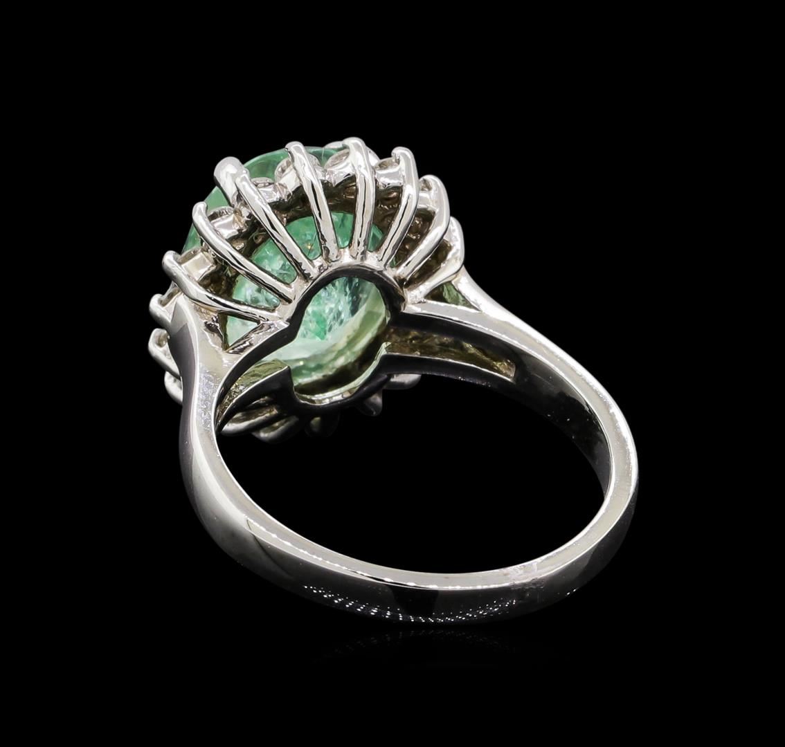 One electronically tested 14KT white gold lady's cast fashion ring with a basket halo with a bright polish finish. The featured lady's ring has a shank measuring 2.45 millimeters in width. Identified with markings of '14K'. Condition is new, good workmanship. Containing: One prong set oval modified brilliant cut natural emerald, measuring 11.10 x 9.15 x 8.08mm, (depth est.) approximate weight of 4.66ct., clarity is heavily included, medium light, moderately strong, green color, (GIA G 4/4), cut is good. Transmitting light somewhat diffusely, transparent to translucent. Indications of oil residue. Naturally occurring internal & external characteristics are present. Colored gemstones are presumed to have been subjected to commonly used enhancement processes. Graded in the setting. Eighteen prong set round brilliant cut diamonds, measuring 2.10 - 2.00 x 1.27mm (depth est.) approximate total weight of 18 Stones = 0.60ct. Graded in the setting. Clarity SI-1 to SI-2. Color: H - I Cut Good. Total Weight of Colored Stones 4.66ct.. Total Weight of Diamonds 0.60ct.. Total Weight of Ring 6.20gm. GAS Appraised at $5,830.00.