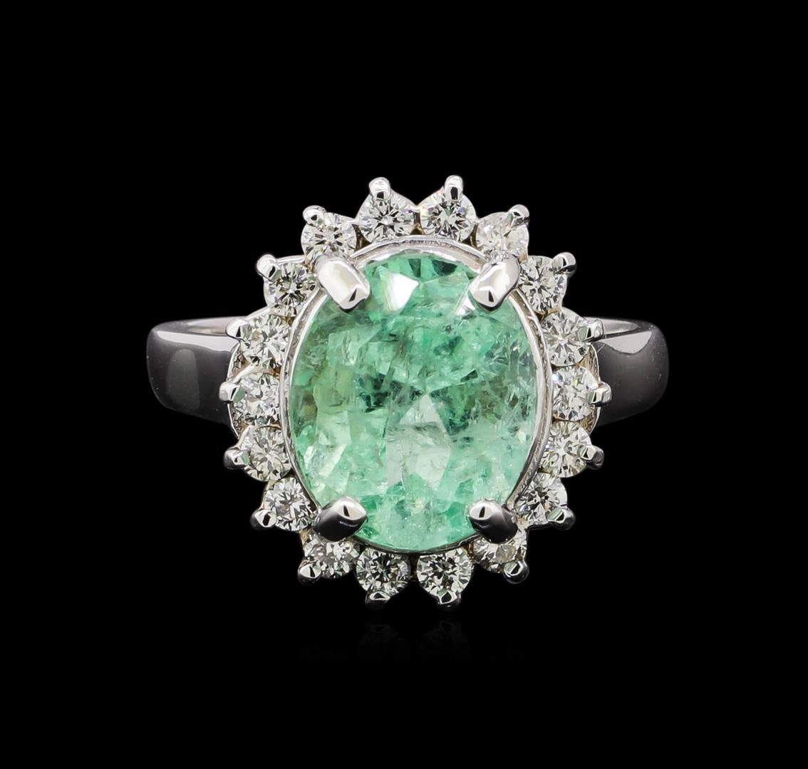 One electronically tested 14KT white gold lady's cast fashion ring with a basket halo with a bright polish finish. The featured lady's ring has a shank measuring 2.45 millimeters in width. Identified with markings of '14K'. Condition is new, good workmanship. Containing: One prong set oval modified brilliant cut natural emerald, measuring 11.10 x 9.15 x 8.08mm, (depth est.) approximate weight of 4.66ct., clarity is heavily included, medium light, moderately strong, green color, (GIA G 4/4), cut is good. Transmitting light somewhat diffusely, transparent to translucent. Indications of oil residue. Naturally occurring internal & external characteristics are present. Colored gemstones are presumed to have been subjected to commonly used enhancement processes. Graded in the setting. Eighteen prong set round brilliant cut diamonds, measuring 2.10 - 2.00 x 1.27mm (depth est.) approximate total weight of 18 Stones = 0.60ct. Graded in the setting. Clarity SI-1 to SI-2. Color: H - I Cut Good. Total Weight of Colored Stones 4.66ct.. Total Weight of Diamonds 0.60ct.. Total Weight of Ring 6.20gm. GAS Appraised at $5,830.00.