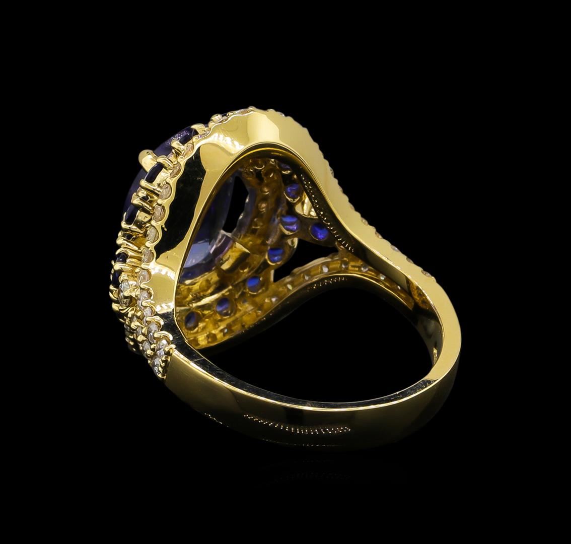 One electronically tested 14KT yellow gold lady's cast fashion ring with a basket halo with a bright polish finish. The featured lady's ring has a shank measuring 3.76 millimeters wide. Identified with markings of "K14". Condition is new, good workmanship. Containing: One prong set oval modified brilliant cut natural tanzanite, measuring 11.05 x 8.45 x 4.87mm, 11%. bulge factor, approximate weight of 3.54ct., clarity is eye clean, type I, medium, moderately strong, bluish violet color, (GIA bV 5/4), cut is excellent. Transmitting light with no distortion, transparent. Colored gemstones are presumed to have been subjected to commonly used enhancement processes. Graded in the setting. Eighteen prong set round modified brilliant cut natural blue sapphires, measuring 2.30 - 2.25 x 1.48 mm, approximate. Total Weight of 1.12ct., clarity is eye clean, type II, medium dark, strong, blue color, (GIA B 6/5), cut is very good. Transmitting light with no distortion, transparent. Graded in the setting. Two prong set round brilliant cut diamonds, measuring 1.80 - 1.70 x 1.09mm (depth est.) approximate. Total Weight of 2 Stones = 0.04ct. Graded in the setting. Clarity: VS-2 to SI-1. Color: Good Seventy-Eight prong set round brilliant cut diamonds, measuring 1.40 - 1.35 x 0.86mm (depth est.) approximate. Total Weight of 78 Stones = 0.78ct. Graded in the setting. Clarity: SI-1 to I-1. Color: H - I. Cut Good. Total Weight of Colored Stones 4.66ct. Total Weight of Diamonds 0.82ct. Total Weight of Ring 8.10gm. GAS Appraised at $10,795.00.