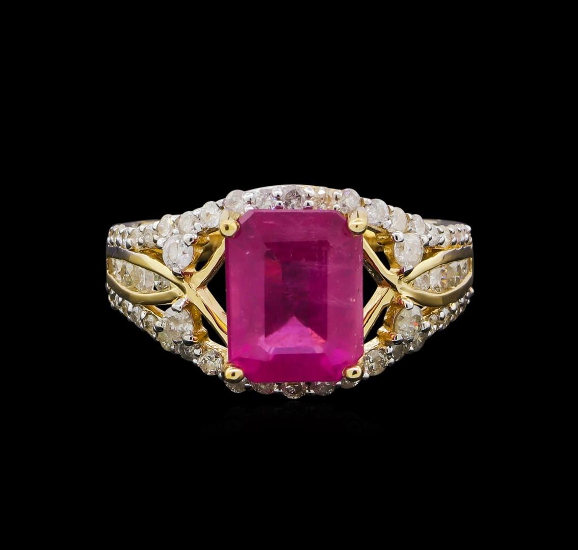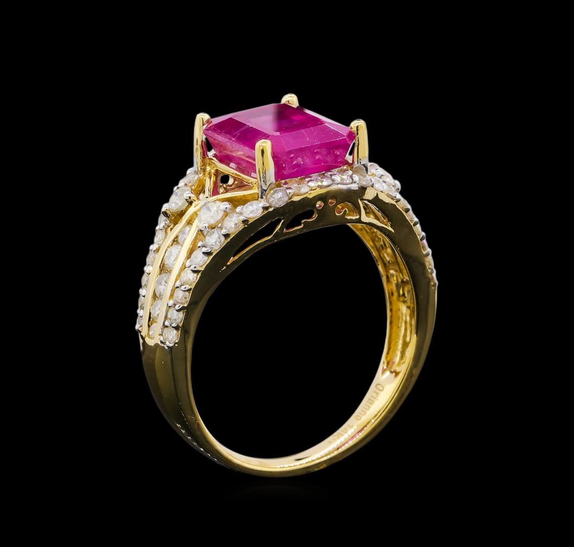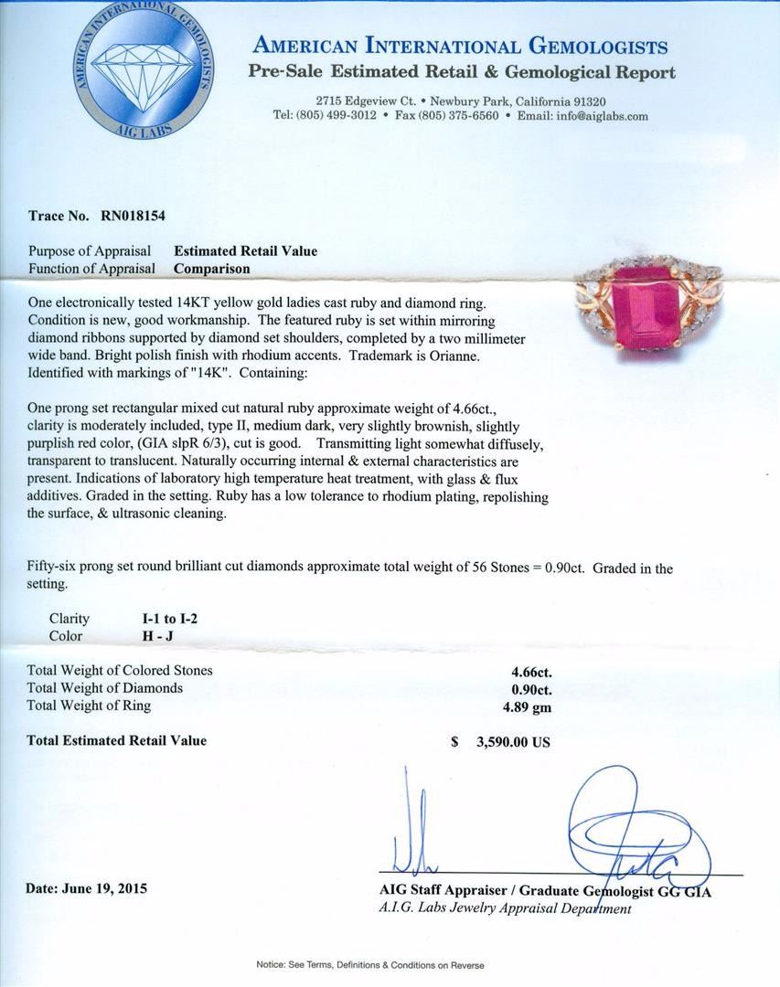 One electronically tested 14KT yellow gold ladies cast ruby and diamond ring. The featured ruby is set within mirroring diamond ribbons supported by diamond set shoulders, completed by a two millimeter wide band. Bright polish finish with rhodium accents. Trademark is Orianne. Identified with markings of "14K". Condition is new, good workmanship. Containing: One prong set rectangular mixed cut natural ruby approximate weight of 4.66ct., clarity is moderately included, type II, medium dark, very slightly brownish, slightly purplish red color, (GIA slpR 6/3), cut is good. Transmitting light somewhat diffusely, transparent to translucent. Naturally occurring internal & external characteristics are present. Indications of laboratory high temperature heat treatment, with glass & flux additives. Graded in the setting. Ruby has a low tolerance to rhodium plating, repolishing the surface, & ultrasonic cleaning. Fifty-Six prong set round brilliant cut diamonds approximate total weight of 56 Stones = 0.90ct. Graded in the setting. Clarity: I-1 to I-2. Color: H - J. Total Weight of Colored Stones 4.66ct. Total Weight of Diamonds 0.90ct. Total Weight of Ring 4.89gm. AIG Appraised at $3,590.00.