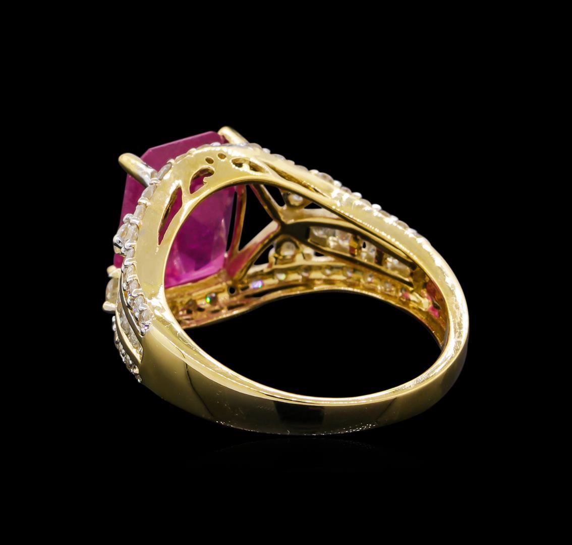 One electronically tested 14KT yellow gold ladies cast ruby and diamond ring. The featured ruby is set within mirroring diamond ribbons supported by diamond set shoulders, completed by a two millimeter wide band. Bright polish finish with rhodium accents. Trademark is Orianne. Identified with markings of "14K". Condition is new, good workmanship. Containing: One prong set rectangular mixed cut natural ruby approximate weight of 4.66ct., clarity is moderately included, type II, medium dark, very slightly brownish, slightly purplish red color, (GIA slpR 6/3), cut is good. Transmitting light somewhat diffusely, transparent to translucent. Naturally occurring internal & external characteristics are present. Indications of laboratory high temperature heat treatment, with glass & flux additives. Graded in the setting. Ruby has a low tolerance to rhodium plating, repolishing the surface, & ultrasonic cleaning. Fifty-Six prong set round brilliant cut diamonds approximate total weight of 56 Stones = 0.90ct. Graded in the setting. Clarity: I-1 to I-2. Color: H - J. Total Weight of Colored Stones 4.66ct. Total Weight of Diamonds 0.90ct. Total Weight of Ring 4.89gm. AIG Appraised at $3,590.00.