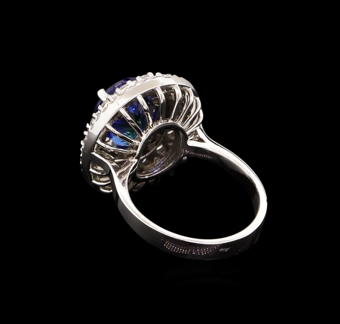 One electronically tested 14KT white gold lady's cast fashion ring with a triple basket halo with a bright polish finish. The featured lady's ring has a shank measuring 3.27 millimeters wide. Identified with markings of "K14". Condition is new, good workmanship. Containing: One prong set oval modified brilliant cut natural tanzanite, measuring 11.62 x 8.90 x 6.73mm, approximate weight of 4.66ct., clarity is eye clean, type I, medium dark, very slightly grayish, violetish blue color, (GIA vB 6/3), cut is very good. Transmitting light with no distortion, transparent. Colored gemstones are presumed to have been subjected to commonly used enhancement processes. Graded in the setting. Sixteen prong set round brilliant cut diamonds, measuring 2.30 - 2.20 x 1.35mm (depth est.) approximate total weight of 16 Stones = 0.65ct. Graded in the setting. Clarity: VS-2 to SI-2. Color: G - Very Good Sixty-Four prong set round brilliant cut diamonds, measuring 1.40 - 1.30 x 0.81mm (depth est.) approximate total weight of 64 Stones = 0.55ct. Graded in the setting. Clarity: SI-1 to I-1. Color: G - Good. Total Weight of Colored Stones 4.66ct. Total Weight of Diamonds 1.20ct. Total Weight of Ring 8.50gm. GAS Appraised at $12,540.00.