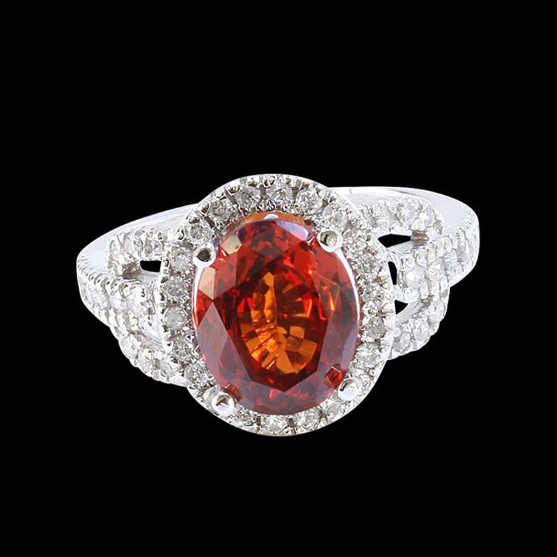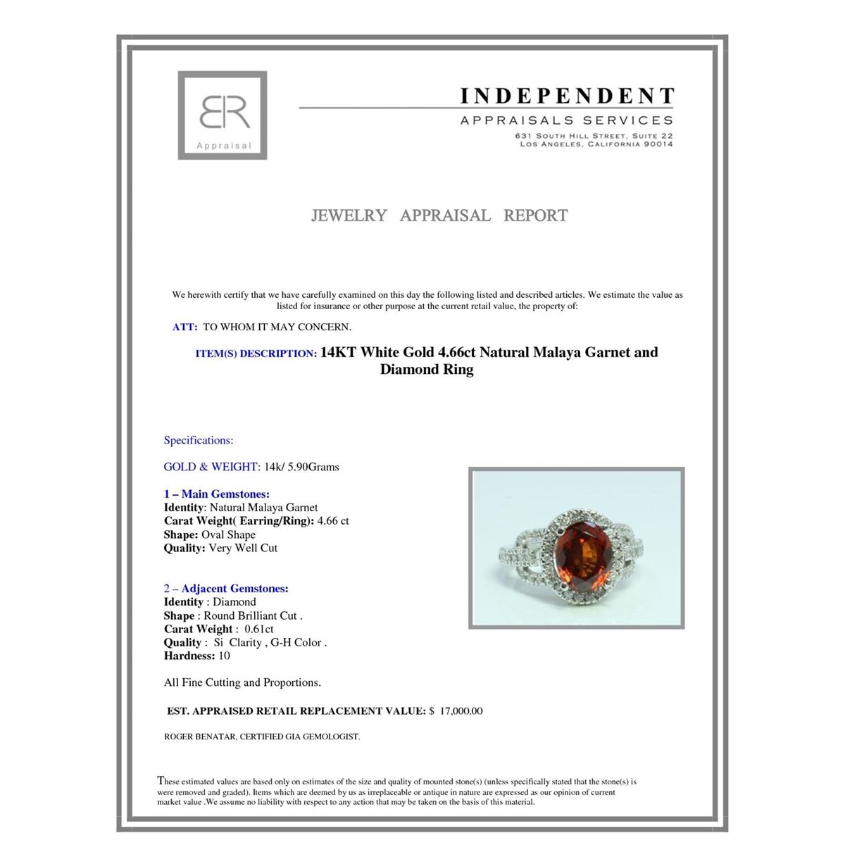 14 WHITE GOLD NATURAL MALAYA GARNET RING:5.90 GRAMS/DIAMOND:0.61CT/MALAYA GARNET:4.66CT/#GVR1046/MALAYA GARNET IS THE VERY RARE GARNET IN THE GARNET FAMILY. VERY HARD TO FIND THIS KIND OF COLOR AND QULAITY