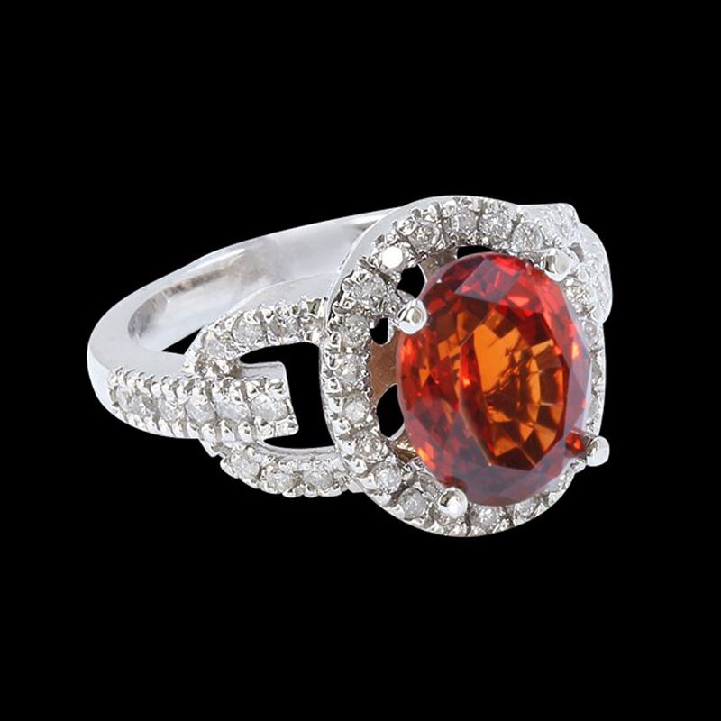 14 WHITE GOLD NATURAL MALAYA GARNET RING:5.90 GRAMS/DIAMOND:0.61CT/MALAYA GARNET:4.66CT/#GVR1046/MALAYA GARNET IS THE VERY RARE GARNET IN THE GARNET FAMILY. VERY HARD TO FIND THIS KIND OF COLOR AND QULAITY