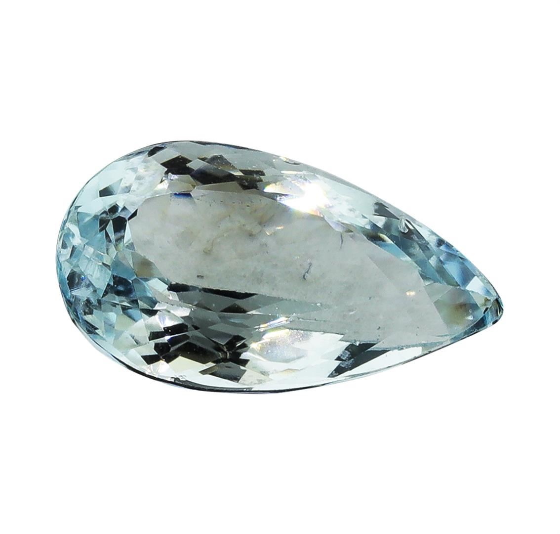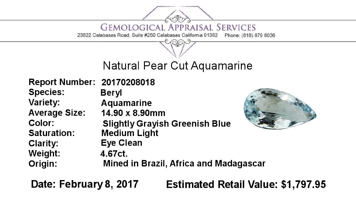 One natural pear cut aquamarine with an exact weight of 4.67ct., clarity is eye clean, slightly grayish greenish blue, medium light. Gemological Appraisals Services estimates the retail value at $1797.95 GAS Appraised.