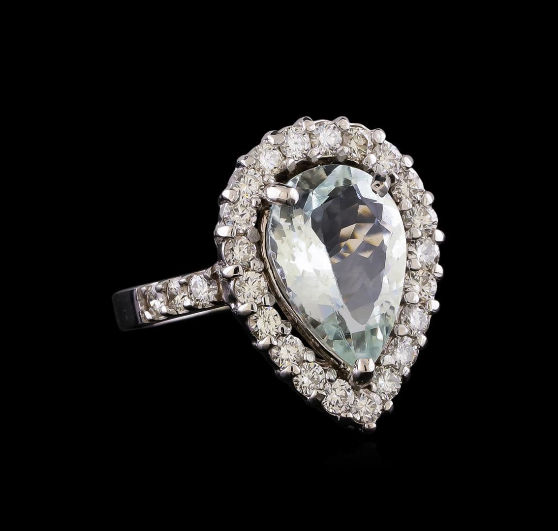 One electronically tested 14KT white gold lady's cast fashion ring with a basket halo with a bright polish finish. The featured lady's ring has a shank measuring 2.75 millimeters wide. Identified with markings of "K14". Condition is new, good workmanship. Containing: One prong set pear modified brilliant cut natural aquamarine, measuring 14.10 x 9.92 x 5.37mm, (depth est.) approximate weight of 4.67ct., clarity is eye clean, light, moderately strong, greenish blue color, (GIA gB 3/4), cut is good. Transmitting light with no distortion, transparent. Colored gemstones are presumed to have been subjected to commonly used enhancement processes. Graded in the setting. Twenty-Seven prong set round brilliant cut diamonds, measuring 2.30 - 2.25 x 1.41mm (depth est.) approximate total weight of 27 Stones = 1.20ct. Graded in the setting. Clarity: VS-2 to SI-1. Color: H - I. Cut Good. Total Weight of Colored Stones 4.67ct. Total Weight of Diamonds 1.20ct. Total Weight of Ring 8.50gm. GAS Appraised at $7,990.00.