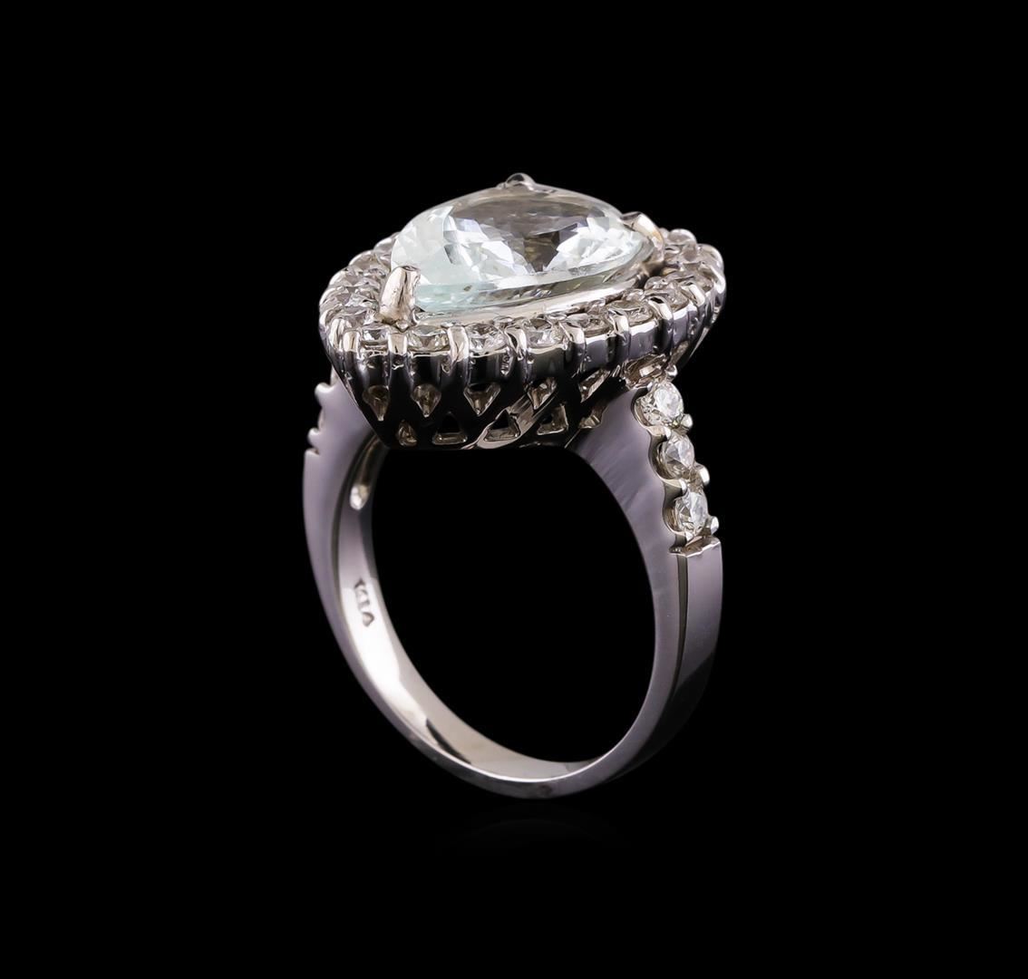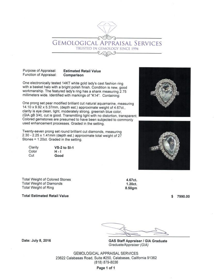 One electronically tested 14KT white gold lady's cast fashion ring with a basket halo with a bright polish finish. The featured lady's ring has a shank measuring 2.75 millimeters wide. Identified with markings of "K14". Condition is new, good workmanship. Containing: One prong set pear modified brilliant cut natural aquamarine, measuring 14.10 x 9.92 x 5.37mm, (depth est.) approximate weight of 4.67ct., clarity is eye clean, light, moderately strong, greenish blue color, (GIA gB 3/4), cut is good. Transmitting light with no distortion, transparent. Colored gemstones are presumed to have been subjected to commonly used enhancement processes. Graded in the setting. Twenty-Seven prong set round brilliant cut diamonds, measuring 2.30 - 2.25 x 1.41mm (depth est.) approximate total weight of 27 Stones = 1.20ct. Graded in the setting. Clarity: VS-2 to SI-1. Color: H - I. Cut Good. Total Weight of Colored Stones 4.67ct. Total Weight of Diamonds 1.20ct. Total Weight of Ring 8.50gm. GAS Appraised.
