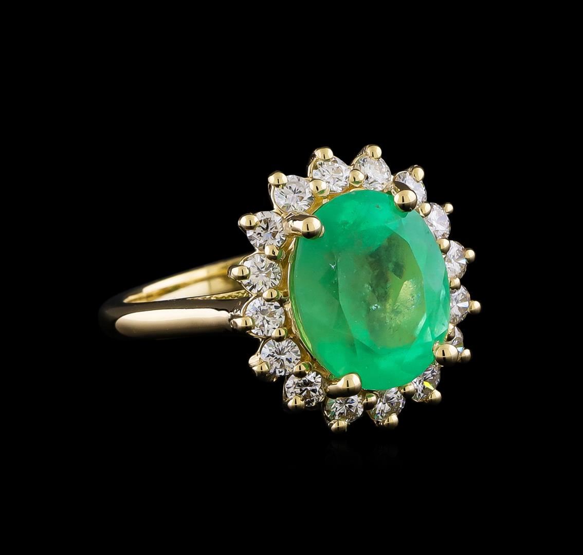 One electronically tested 14KT yellow gold lady's cast fashion ring with a cathedral basket halo with a bright polish finish. The featured lady's has a shank measuring 2.05 millimeters in width. Identified with markings of "14K". Condition is new, good workmanship. Containing: One prong set oval modified brilliant cut natural emerald, measuring 11.65 x 9.46 x 7.33mm, (depth est.) approximate weight of 4.67ct., clarity is heavily included, medium light, moderately strong, green color, (GIA G 4/4), cut is good. Transmitting light somewhat diffusely, transparent to translucent. Indications of oil residue. Naturally occurring internal & external characteristics are present. Colored gemstones are presumed to have been subjected to commonly used enhancement processes. Graded in the setting. Sixteen prong set round brilliant cut diamonds, measuring 2.35 - 2.25 x 1.42mm (depth est.) approximate total weight of 16 Stones = 0.74ct. Graded in the setting. Clarity: SI-1 to SI-2. Color: H - I. Cut Good. Total Weight of Colored Stones 4.67ct. Total Weight of Diamonds 0.74ct. Total Weight of Ring 5.80gm. GAS Appraised.