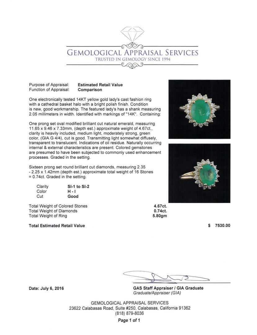 One electronically tested 14KT yellow gold lady's cast fashion ring with a cathedral basket halo with a bright polish finish. The featured lady's has a shank measuring 2.05 millimeters in width. Identified with markings of "14K". Condition is new, good workmanship. Containing: One prong set oval modified brilliant cut natural emerald, measuring 11.65 x 9.46 x 7.33mm, (depth est.) approximate weight of 4.67ct., clarity is heavily included, medium light, moderately strong, green color, (GIA G 4/4), cut is good. Transmitting light somewhat diffusely, transparent to translucent. Indications of oil residue. Naturally occurring internal & external characteristics are present. Colored gemstones are presumed to have been subjected to commonly used enhancement processes. Graded in the setting. Sixteen prong set round brilliant cut diamonds, measuring 2.35 - 2.25 x 1.42mm (depth est.) approximate total weight of 16 Stones = 0.74ct. Graded in the setting. Clarity: SI-1 to SI-2. Color: H - I. Cut Good. Total Weight of Colored Stones 4.67ct. Total Weight of Diamonds 0.74ct. Total Weight of Ring 5.80gm. GAS Appraised.