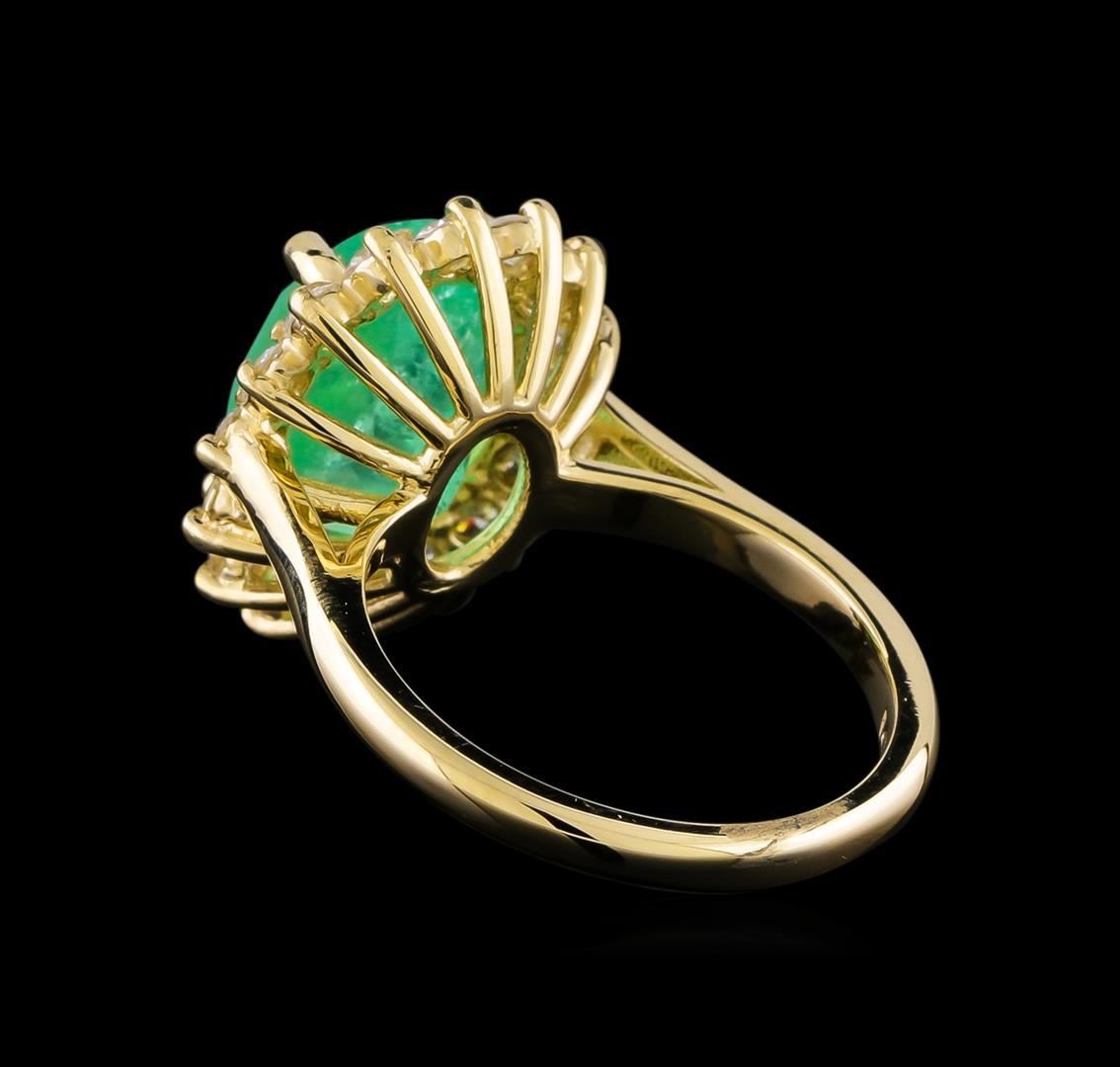 One electronically tested 14KT yellow gold lady's cast fashion ring with a cathedral basket halo with a bright polish finish. The featured lady's has a shank measuring 2.05 millimeters in width. Identified with markings of "14K". Condition is new, good workmanship. Containing: One prong set oval modified brilliant cut natural emerald, measuring 11.65 x 9.46 x 7.33mm, (depth est.) approximate weight of 4.67ct., clarity is heavily included, medium light, moderately strong, green color, (GIA G 4/4), cut is good. Transmitting light somewhat diffusely, transparent to translucent. Indications of oil residue. Naturally occurring internal & external characteristics are present. Colored gemstones are presumed to have been subjected to commonly used enhancement processes. Graded in the setting. Sixteen prong set round brilliant cut diamonds, measuring 2.35 - 2.25 x 1.42mm (depth est.) approximate total weight of 16 Stones = 0.74ct. Graded in the setting. Clarity: SI-1 to SI-2. Color: H - I. Cut Good. Total Weight of Colored Stones 4.67ct. Total Weight of Diamonds 0.74ct. Total Weight of Ring 5.80gm. GAS Appraised.