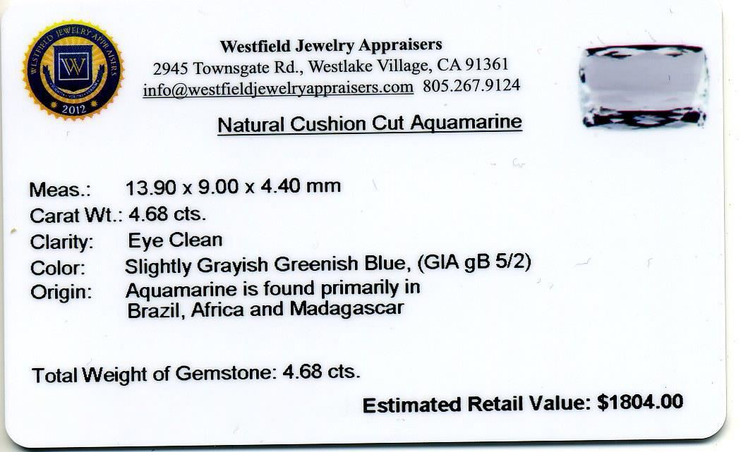 4.68ct Cushion Cut Natural Cushion Cut Aquamarine. Westfield Appraised at $1,804.00.