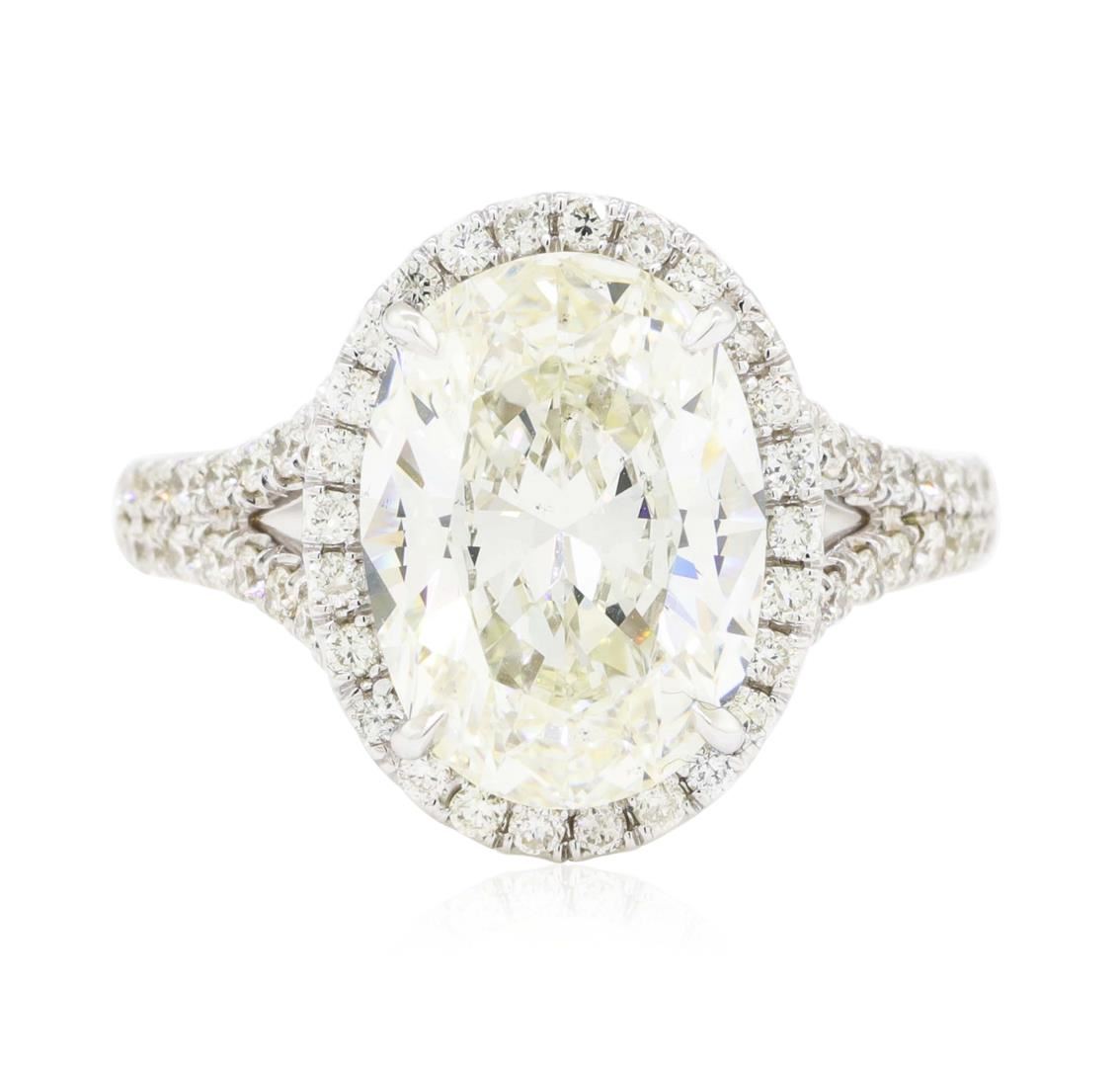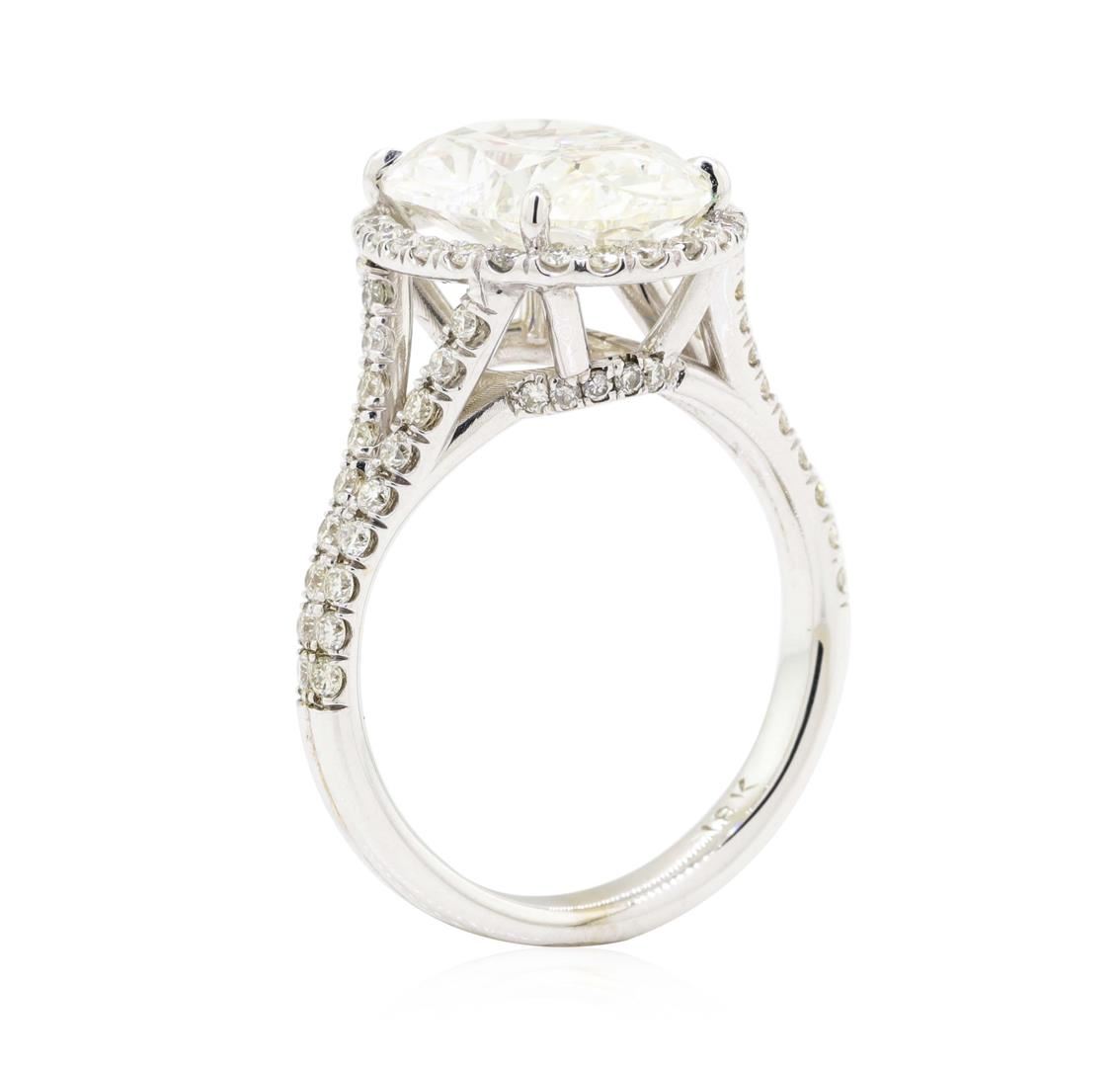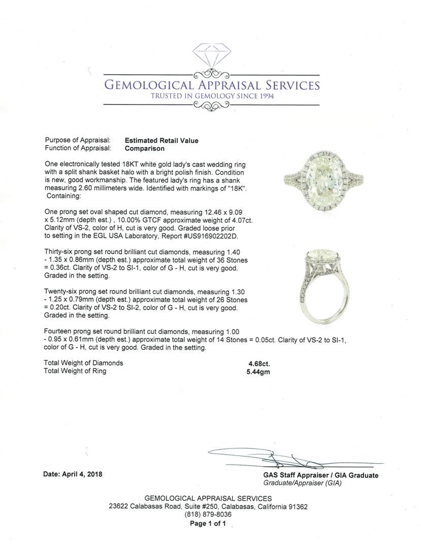 One electronically tested 18KT white gold lady's cast wedding ring with a split shank basket halo with a bright polish finish. The featured lady's ring has a shank measuring 2.60 millimeters wide. Identified with markings of '18K'. Condition is new, good workmanship. Containing: One prong set oval shaped cut diamond, measuring 12.46 x 9.09 x 5.12mm (depth est.) , 10.00.%. GTCF approximate weight of 4.07ct. Graded loose prior to setting in the EGL USA Laboratory, Report #US916902202D. Color H Clarity VS-2 Cut Very Good Thirty-Six prong set round brilliant cut diamonds, measuring 1.40 - 1.35 x 0.86mm (depth est.) approximate total weight of 36 Stones = 0.36ct. Graded in the setting. Color G - H Clarity VS-2 to SI-1 Cut Very Good Twenty-Six prong set round brilliant cut diamonds, measuring 1.30 - 1.25 x 0.79mm (depth est.) approximate total weight of 26 Stones = 0.20ct. Graded in the setting. Color G - H Clarity VS-2 to SI-2 Cut Very Good Fourteen prong set round brilliant cut diamonds, measuring 1.00 - 0.95 x 0.61mm (depth est.) approximate total weight of 14 Stones = 0.05ct. Graded in the setting. Color G - H Clarity VS-2 to SI-1 Cut Very Good. Total Weight of Diamonds 4.68ct.. Total Weight of Ring 5.44gm GAS Appraised at $153755.00. GAS Appraised at $153,755.00.