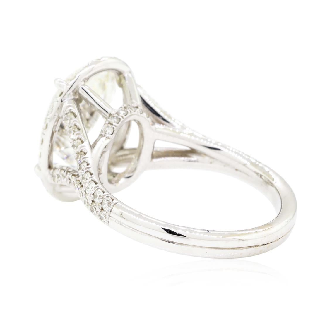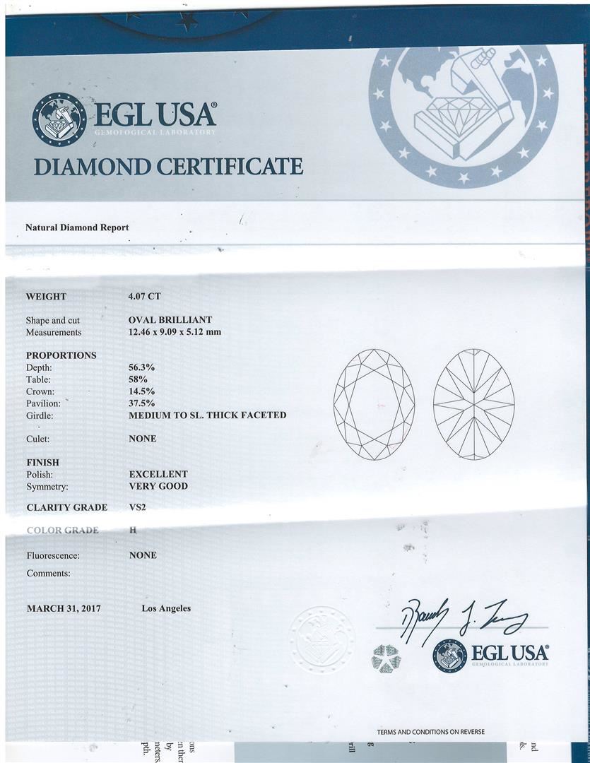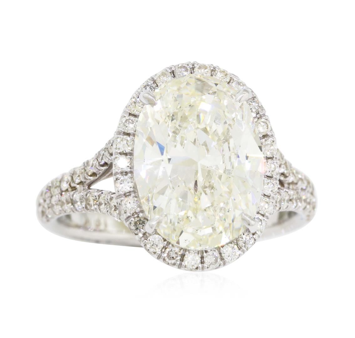 One electronically tested 18KT white gold lady's cast wedding ring with a split shank basket halo with a bright polish finish. The featured lady's ring has a shank measuring 2.60 millimeters wide. Identified with markings of '18K'. Condition is new, good workmanship. Containing: One prong set oval shaped cut diamond, measuring 12.46 x 9.09 x 5.12mm (depth est.) , 10.00.%. GTCF approximate weight of 4.07ct. Graded loose prior to setting in the EGL USA Laboratory, Report #US916902202D. Color H Clarity VS-2 Cut Very Good Thirty-Six prong set round brilliant cut diamonds, measuring 1.40 - 1.35 x 0.86mm (depth est.) approximate total weight of 36 Stones = 0.36ct. Graded in the setting. Color G - H Clarity VS-2 to SI-1 Cut Very Good Twenty-Six prong set round brilliant cut diamonds, measuring 1.30 - 1.25 x 0.79mm (depth est.) approximate total weight of 26 Stones = 0.20ct. Graded in the setting. Color G - H Clarity VS-2 to SI-2 Cut Very Good Fourteen prong set round brilliant cut diamonds, measuring 1.00 - 0.95 x 0.61mm (depth est.) approximate total weight of 14 Stones = 0.05ct. Graded in the setting. Color G - H Clarity VS-2 to SI-1 Cut Very Good. Total Weight of Diamonds 4.68ct.. Total Weight of Ring 5.44gm GAS Appraised at $153755.00. GAS Appraised at $153,755.00.