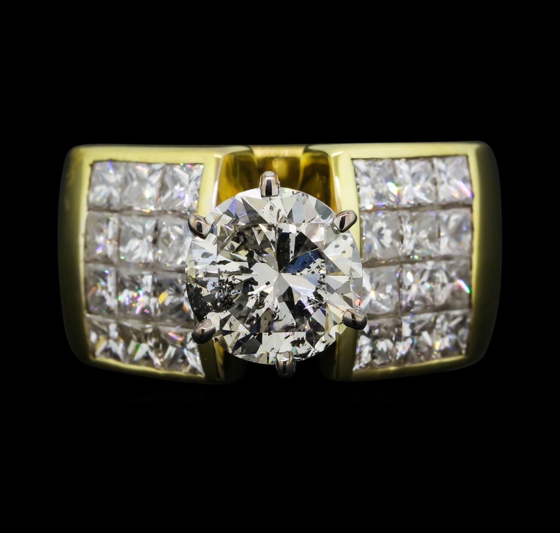 One electronically tested 18KT yellow gold lady's combination cast & assembled wedding ring with a wide band with a bright polish finish. The featured lady's ring has a shank measuring 8.40 millimeters wide. Identified with markings of '18K'. Condition is new, good workmanship. Containing: One prong set round brilliant cut diamond, measuring 8.35 - 8.26 x 4.99mm (depth est.) approximate weight of 2.18ct. Graded in the setting. Clarity I-1. Color: J Cut Good Twenty-Four invisible set princess cut diamonds, measuring 2.60 x 2.50 x 1.88mm (depth est.) approximate total weight of 24 Stones = 2.50ct. Graded in the setting. Clarity VS-2 to SI-2. Color: F - G Cut Very Good. Total Weight of Diamonds 4.68ct.. Total Weight of Ring 17.50gm GAS Appraised at $27,355.00.