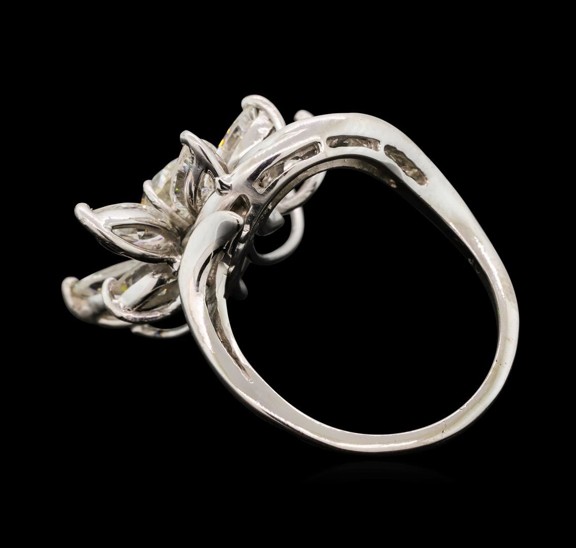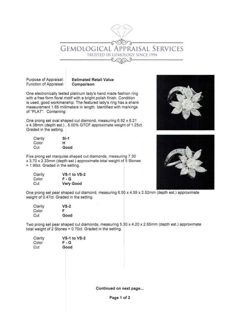 One electronically tested platinum lady's hand made fashion ring with a free form floral motif with a bright polish finish. The featured lady's ring has a shank measurement 1.65 millimeters in length. Identified with markings of 'PLAT'. Condition is used, GAS Appraised at $27,205.00.