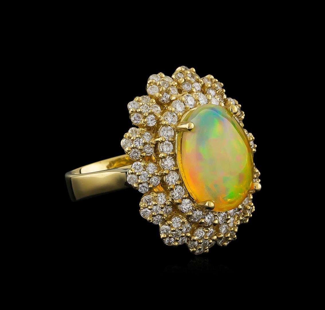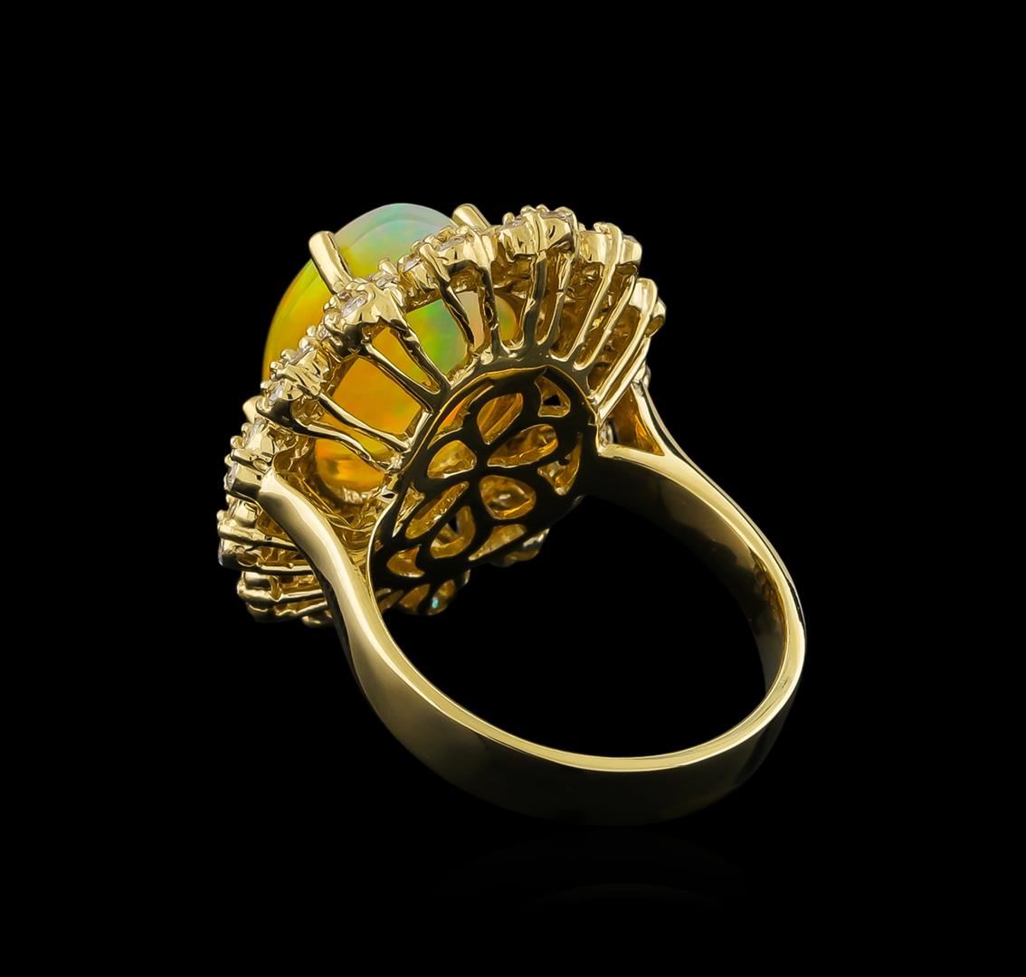 One electronically tested 14KT yellow gold lady's cast fashion ring with a double basket halo with a bright polish finish. The featured lady's ring has a shank measuring 4.08 millimeters wide. Identified with markings of "K14". Condition is new, good workmanship. Containing: One semi crystal opal that is cut in a oval shaped cabochon and is prong set, measuring 14.01 mm long x 10.02 mm wide, and 6.50 mm thick and the approximate weight is 4.68 carats. The opal has a bright, multicolor play of color (fire) in a rolling flashfire pattern; a high dome; a good cut; no inclusions; slight variation in base in its brightness and pattern; and is not directional. Graded in the setting. Twenty-Two prong set round brilliant cut diamonds, measuring 1.90 - 1.85 x 1.17mm (depth est.) approximate total weight of 22 Stones = 0.55ct. Graded in the setting. Clarity: VS-2 to SI-2. Color: G - Good Eighty-Four prong set round brilliant cut diamonds, measuring 1.50 - 1.40 x 0.90mm (depth est.) approximate total weight of 84 Stones = 0.97ct. Graded in the setting. Clarity: SI-1 to I-1. Color: H - I. Cut Good. Total Weight of Diamonds 1.52ct. Total Weight of Opals 4.68ct. Total Weight of Ring 10.10gm. GAS Appraised at $6,750.00.