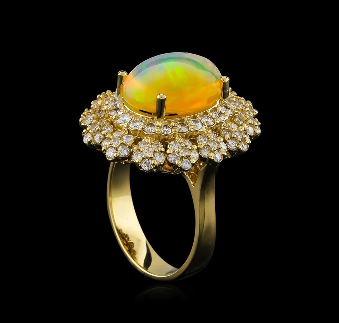 One electronically tested 14KT yellow gold lady's cast fashion ring with a double basket halo with a bright polish finish. The featured lady's ring has a shank measuring 4.08 millimeters wide. Identified with markings of "K14". Condition is new, good workmanship. Containing: One semi crystal opal that is cut in a oval shaped cabochon and is prong set, measuring 14.01 mm long x 10.02 mm wide, and 6.50 mm thick and the approximate weight is 4.68 carats. The opal has a bright, multicolor play of color (fire) in a rolling flashfire pattern; a high dome; a good cut; no inclusions; slight variation in base in its brightness and pattern; and is not directional. Graded in the setting. Twenty-Two prong set round brilliant cut diamonds, measuring 1.90 - 1.85 x 1.17mm (depth est.) approximate total weight of 22 Stones = 0.55ct. Graded in the setting. Clarity: VS-2 to SI-2. Color: G - Good Eighty-Four prong set round brilliant cut diamonds, measuring 1.50 - 1.40 x 0.90mm (depth est.) approximate total weight of 84 Stones = 0.97ct. Graded in the setting. Clarity: SI-1 to I-1. Color: H - I. Cut Good. Total Weight of Diamonds 1.52ct. Total Weight of Opals 4.68ct. Total Weight of Ring 10.10gm. GAS Appraised at $6,750.00.