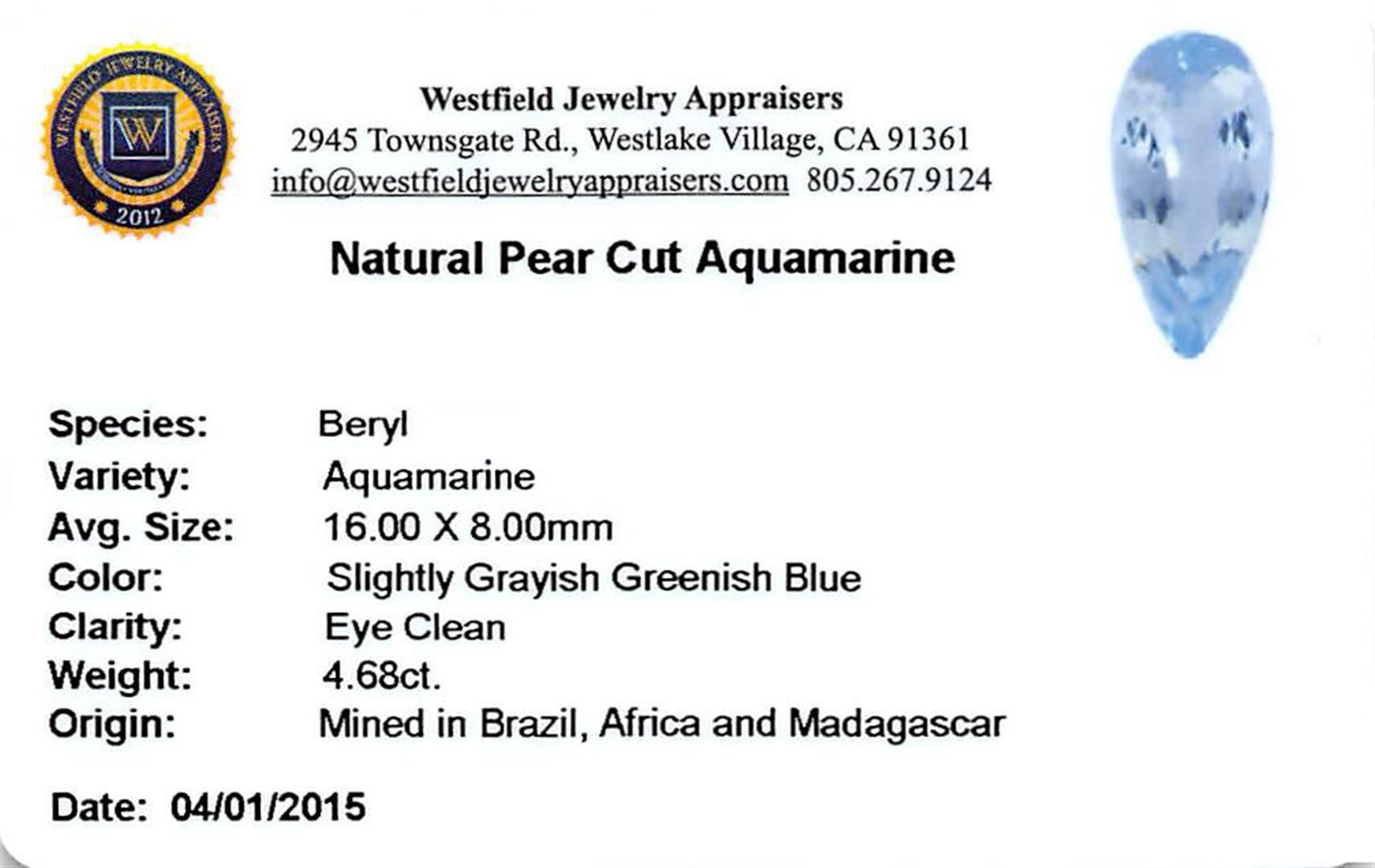 One pear cut natural aquamarine exact weight 4.68ct., clarity is eye clean, type I, medium, slightly grayish, very slightly greenish blue color, (GIA vslgB 5/2), cut is good. UGS Appraised.