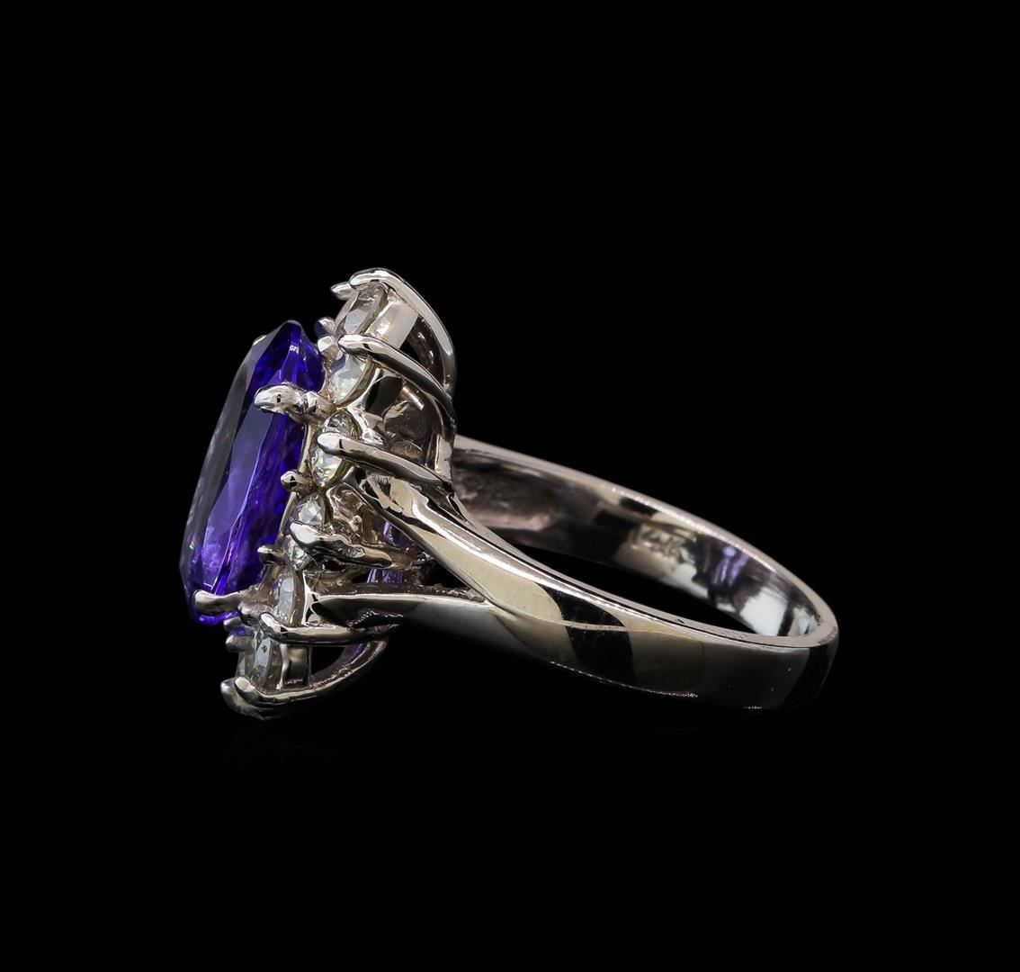 One electronically tested 14KT white gold lady's cast fashion ring with a basket halo with a bright polish finish. The featured lady's ring has a shank measuring 2.82 millimeters wide. Identified with markings of '14K'. Condition is new, good workmanship. Containing: One prong set oval modified brilliant cut natural tanzanite, measuring 13.11 x 9.10 x 5.07mm, (depth est.) 8%. bulge factor, approximate weight of 4.68ct., clarity is eye clean, medium, moderately strong, violetish blue color, (GIA vB 5/4), cut is very good. Transmitting light with no distortion, transparent. Colored gemstones are presumed to have been subjected to commonly used enhancement processes. Graded in the setting. Twelve prong set round brilliant cut diamonds, measuring 3.35 - 3.25 x 2.05mm (depth est.) approximate total weight of 12 Stones = 1.62ct. Graded in the setting. Clarity SI-1 to SI-2. Color: I - J Cut Very Good. Total Weight of Colored Stones 4.68ct.. Total Weight of Diamonds 1.62ct.. Total Weight of Ring 8.30gm GAS Appraised at $12,200.00.