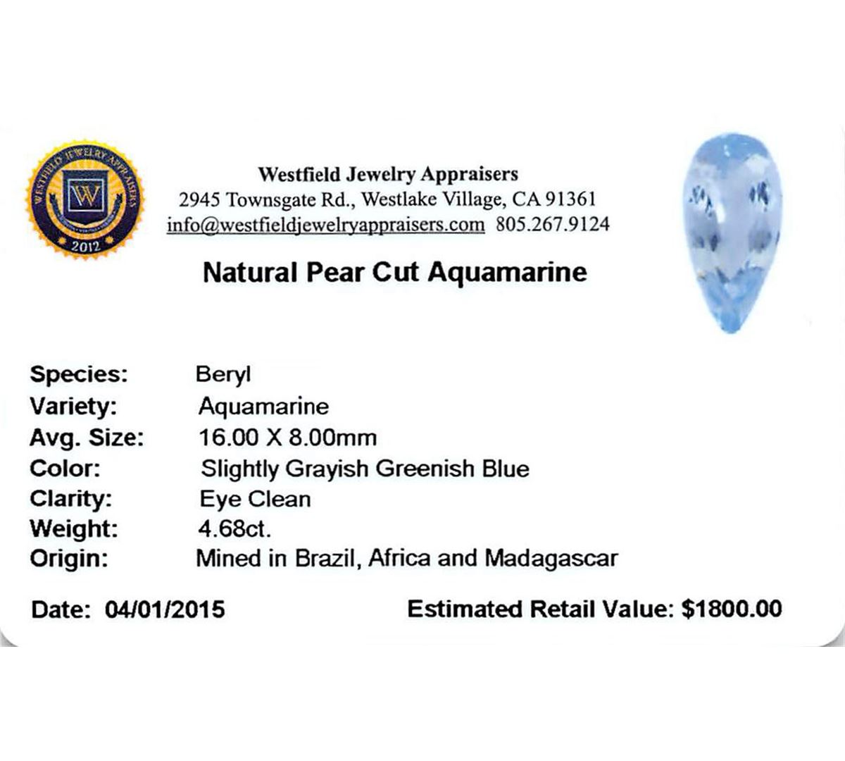 One pear cut natural aquamarine exact weight 4.68ct., clarity is eye clean, type I, medium, slightly grayish, very slightly greenish blue color, (GIA vslgB 5/2), cut is good. UGS Appraised at $1,800.00.