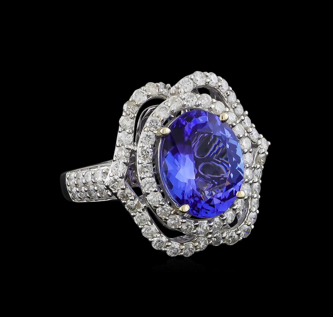 One electronically tested 14KT white gold ladies cast tanzanite and diamond ring with a bright polish finish. The featured tanzanite is set within stylized diamond bezels supported by diamond set shoulders, completed by a one and one-half millimeter wide band. Trademark is Orianne. Identified with markings of "14K". Condition is new, good workmanship. Containing: One prong set oval mixed cut natural tanzanite, measuring 12.00 x 9.70 x 5.40mm, 6%. bulge factor, approximate weight of 4.69ct., clarity is eye clean, type I, medium dark, very slightly grayish, bluish violet color, (GIA bV 6/3), cut is good. Transmitting light with no distortion, transparent. Graded in the setting. Tanzanite is a very rare gemstone that is only found in the country of Tanzania. Originally discovered in 1967. Tiffany & Company, named the stone Tanzanite. It is found in the Usumburu Mountains that border the Umba Valley of northern Tanzania. Tanzanite occurs in gray, brown, violet, blue, reddish-purple, & green. The gem is interesting because of its exceptional pleochroism. Rotated in different directions a tanzanite will exhibit multiple changes of color. Tanzanite has a low tolerance to ultrasonic cleaning, and should not be cleaned using this method. Seventy-Four prong set round brilliant cut diamonds, measuring 1.80 - 1.70 x 1.05mm (depth est.) approximate total weight of 74 Stones = 1.42ct. Graded in the setting. Clarity: I-1 to I-3. Color: G - I. Total Weight of Colored Stones 4.69ct. Total Weight of Diamonds 1.42ct. Total Weight of Ring 6.77gm. AIG Appraised at $14,240.00.