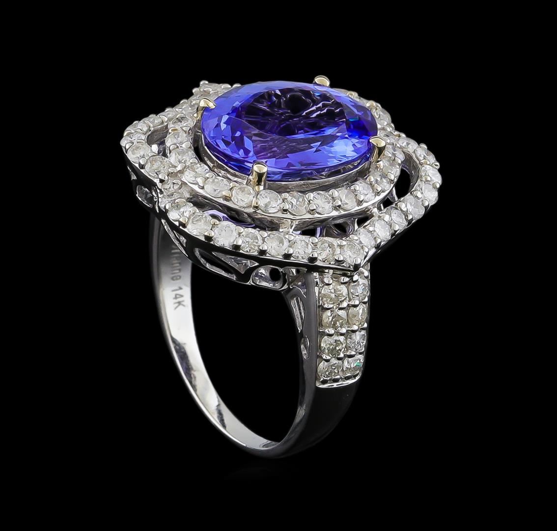 One electronically tested 14KT white gold ladies cast tanzanite and diamond ring with a bright polish finish. The featured tanzanite is set within stylized diamond bezels supported by diamond set shoulders, completed by a one and one-half millimeter wide band. Trademark is Orianne. Identified with markings of "14K". Condition is new, good workmanship. Containing: One prong set oval mixed cut natural tanzanite, measuring 12.00 x 9.70 x 5.40mm, 6%. bulge factor, approximate weight of 4.69ct., clarity is eye clean, type I, medium dark, very slightly grayish, bluish violet color, (GIA bV 6/3), cut is good. Transmitting light with no distortion, transparent. Graded in the setting. Tanzanite is a very rare gemstone that is only found in the country of Tanzania. Originally discovered in 1967. Tiffany & Company, named the stone Tanzanite. It is found in the Usumburu Mountains that border the Umba Valley of northern Tanzania. Tanzanite occurs in gray, brown, violet, blue, reddish-purple, & green. The gem is interesting because of its exceptional pleochroism. Rotated in different directions a tanzanite will exhibit multiple changes of color. Tanzanite has a low tolerance to ultrasonic cleaning, and should not be cleaned using this method. Seventy-Four prong set round brilliant cut diamonds, measuring 1.80 - 1.70 x 1.05mm (depth est.) approximate total weight of 74 Stones = 1.42ct. Graded in the setting. Clarity: I-1 to I-3. Color: G - I. Total Weight of Colored Stones 4.69ct. Total Weight of Diamonds 1.42ct. Total Weight of Ring 6.77gm. AIG Appraised at $14,240.00.