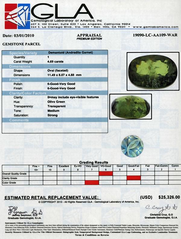Very good green specimen oval cut and clear; lab quality evaluation 6; no treatment noted; Gem Guide wholesale $8442-$14070; full retail appraisal $25326; full lab evaluation included
