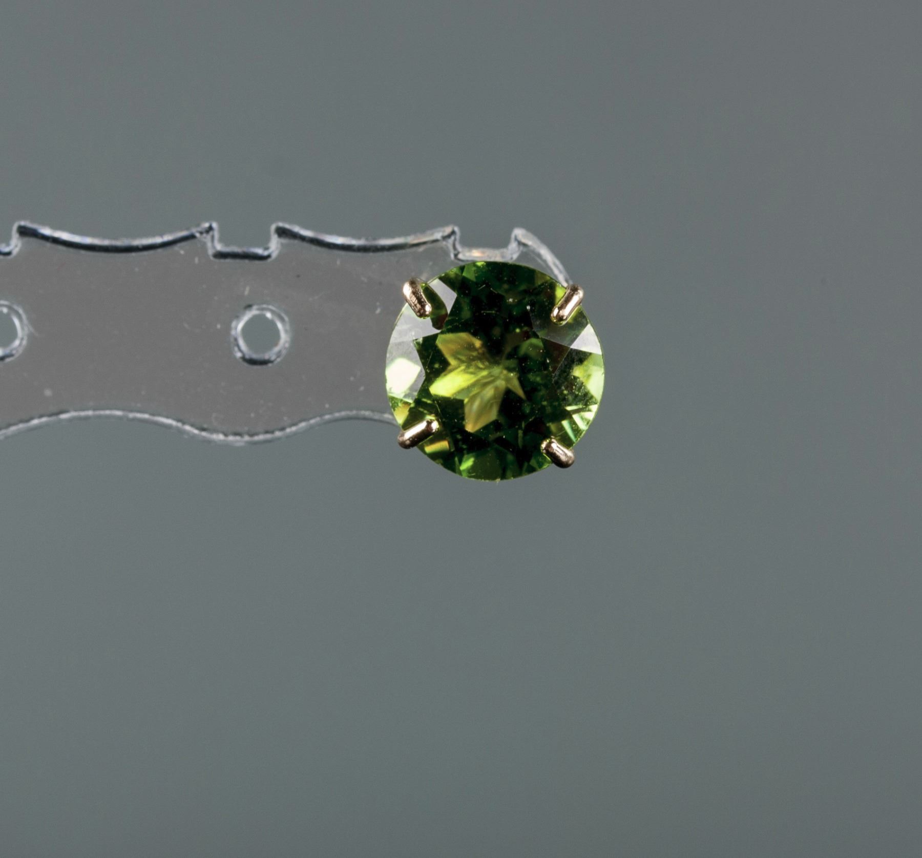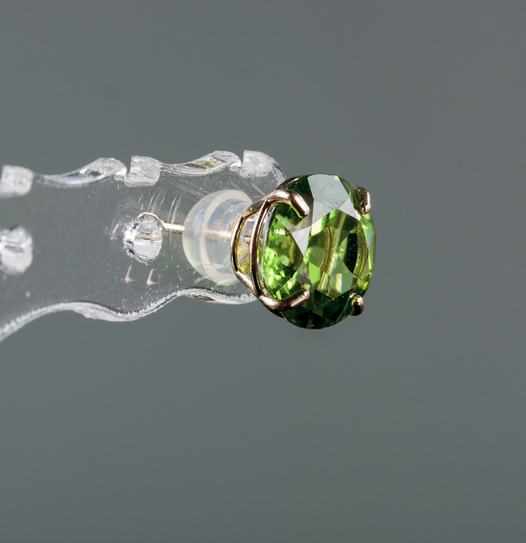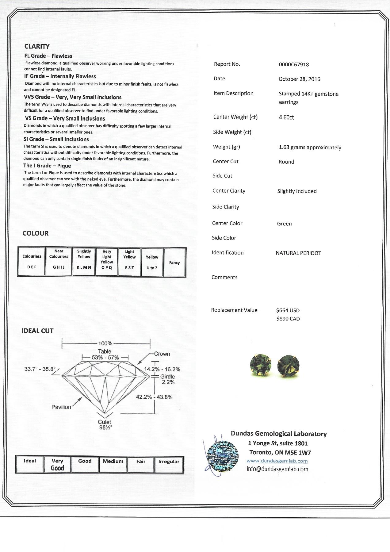 Stamped 14k stud earrings; set with 4.60ct round cut green peridot; certified replacement value $890; 1.63 grams