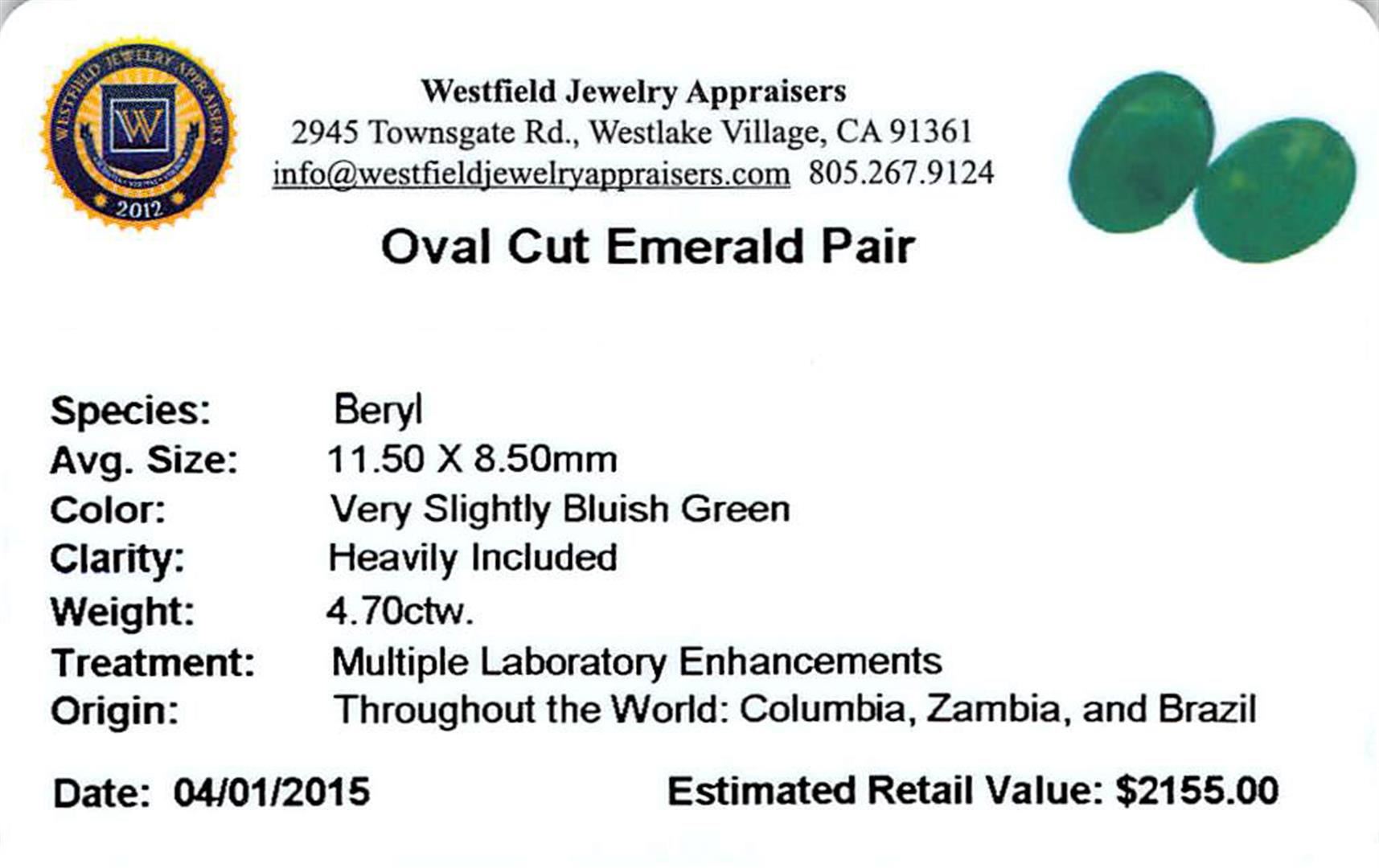 Two oval mixed cut natural emeralds, measuring 11.77 x 8.94 x 3.70mm, approximate total weight of 4.70ct., clarity is heavily included, type III, medium dark, very slightly grayish, very slightly bluish green color, (GIA vslbG 6/3), cut is good. Indications of multiple laboratory enhancements, including high temperature heat treatment. Westfield Appraised at $2,155.00.