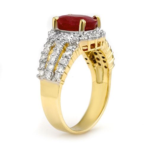 4.70 CTW Ruby & Diamond Ring 14K Yellow Gold ---- Luxury Designer Brand Ring Appraised Retail Price at $8,900 ---- SKU Number US13151 14k Yellow gold Ring Size is 7, Ring measuring approx. 3/4" x 1/2" , weighing in total approx. 6.6 grams. Made in the USA and is stamped 14k, Main stone 3.2 carat total weight containing 1 pieces of Mid-Opaque-Deep Red color with AAA quality Oval shape cut Ruby , Stone #2 1.5 carat total weight containing 48 pieces of H-I color with VS/SI quality Round shape cut