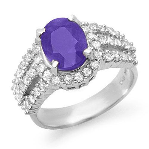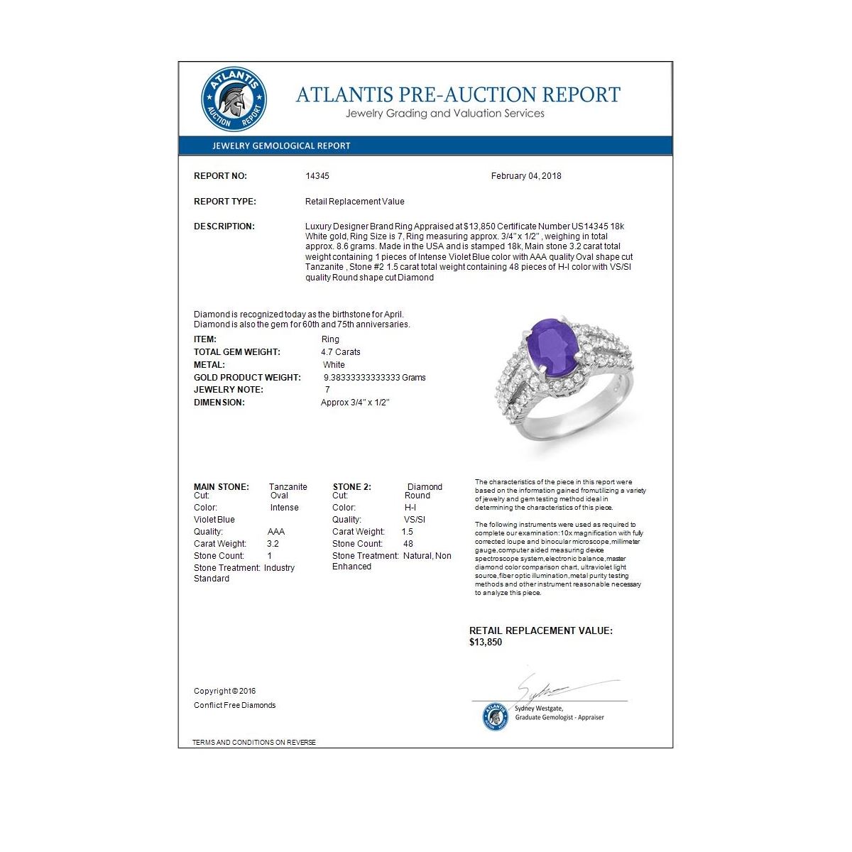 REF-180Y2K -14345 ---- 4.70 CTW Tanzanite & Diamond Ring 18K White Gold ---- Luxury Designer Brand Ring Appraised at $13,850 Certificate Number US14345 18k White gold, Ring Size is 7, Ring measuring approx. 3/4" x 1/2" , weighing in total approx. 8.6 grams. Made in the USA and is stamped 18k, Main stone 3.2 carat total weight containing 1 pieces of Intense Violet Blue color with AAA quality Oval shape cut Tanzanite , Stone #2 1.5 carat total weight containing 48 pieces of H-I color with VS/SI quality Round shape cut Diamond