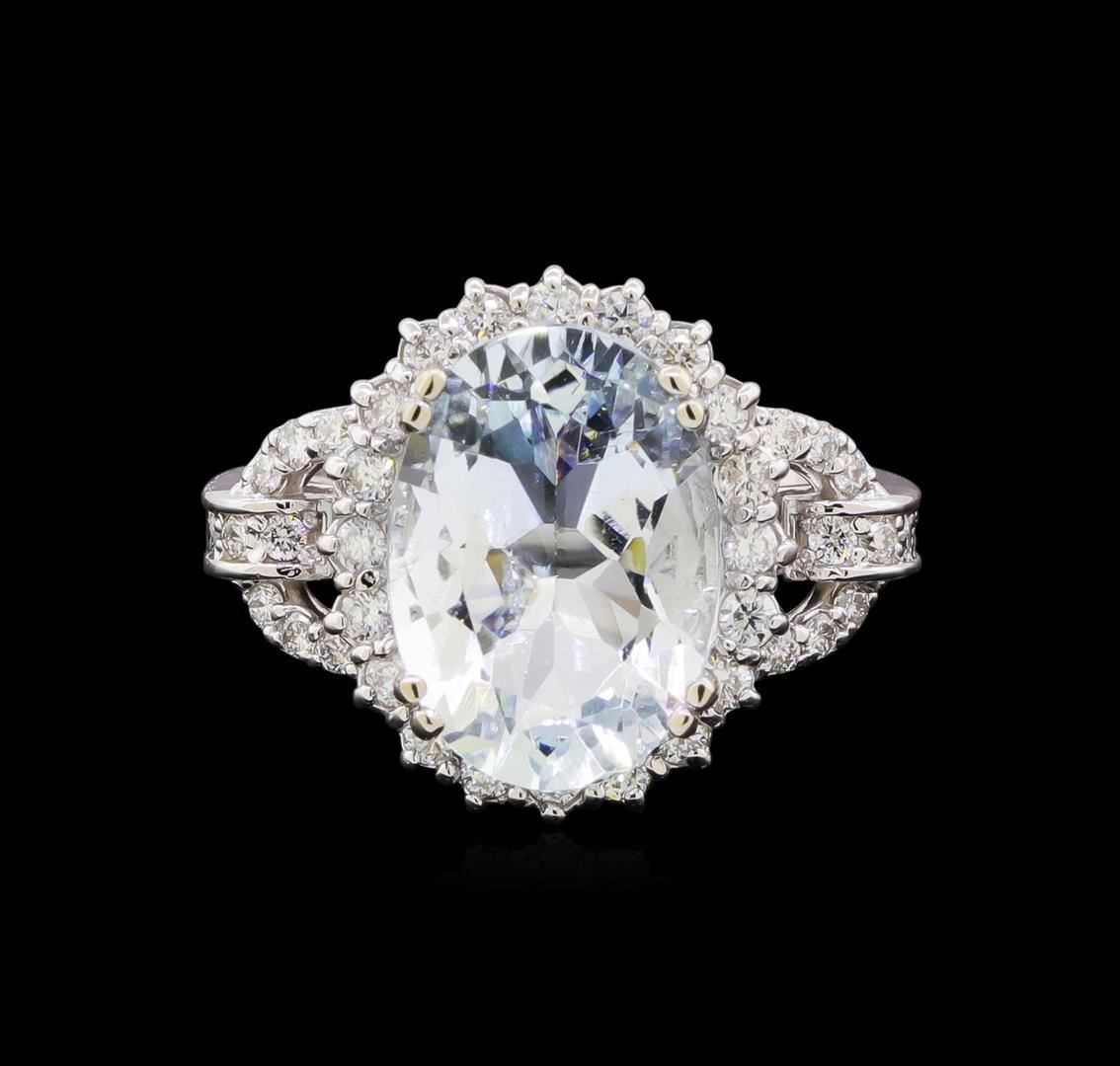 One electronically tested 14KT white gold lady's cast fashion ring with a basket halo with a bright polish finish. The featured lady's ring has a shank measuring 2.94 millimeters in width. Identified with markings of "K14". Condition is new, good workmanship. Containing: One prong set oval modified brilliant cut natural aquamarine, measuring 13.97 x 9.90 x 6.10mm, (depth est.) approximate weight of 4.70ct., clarity is slightly included, light, moderately strong, blue color, (GIA B 3/4), cut is very good. Transmitting light with no distortion, transparent. Colored gemstones are presumed to have been subjected to commonly used enhancement processes. Graded in the setting. Twenty prong set round brilliant cut diamonds, measuring 1.80 - 1.70 x 1.09mm (depth est.) approximate total weight of 20 Stones = 0.43ct. Graded in the setting. Clarity: VS-2. Color: G - Good Twenty-Eight prong set round brilliant cut diamonds, measuring 1.50 - 1.40 x 0.90mm (depth est.) approximate total weight of 28 Stones = 0.35ct. Graded in the setting. Clarity: VS-2 to SI-1. Color: G - Very Good. Total Weight of Colored Stones 4.70ct. Total Weight of Diamonds 0.78ct. Total Weight of Ring 6.90gm. GAS Appraised at $6,005.00.