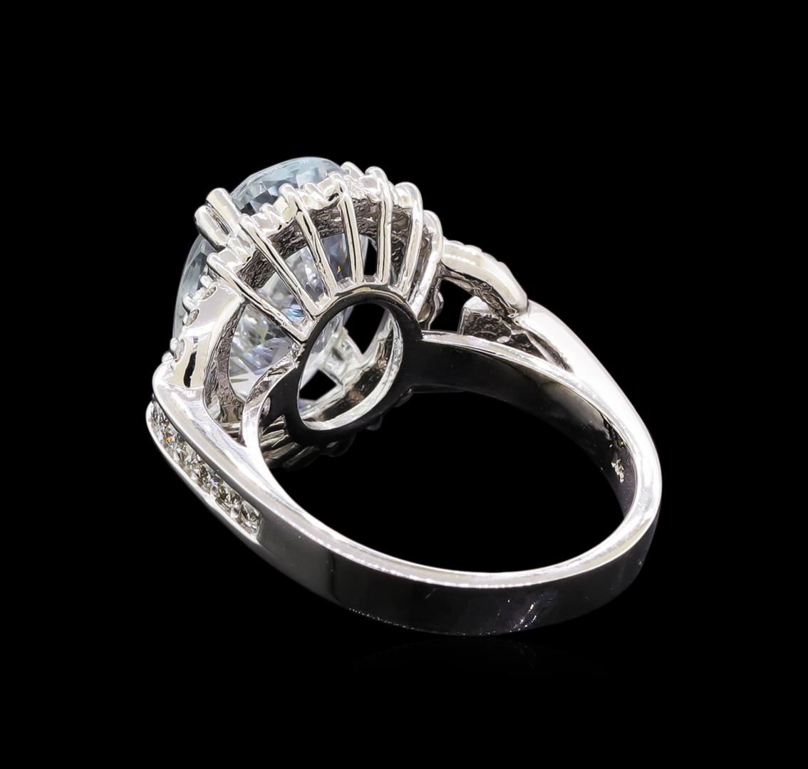 One electronically tested 14KT white gold lady's cast fashion ring with a basket halo with a bright polish finish. The featured lady's ring has a shank measuring 2.94 millimeters in width. Identified with markings of "K14". Condition is new, good workmanship. Containing: One prong set oval modified brilliant cut natural aquamarine, measuring 13.97 x 9.90 x 6.10mm, (depth est.) approximate weight of 4.70ct., clarity is slightly included, light, moderately strong, blue color, (GIA B 3/4), cut is very good. Transmitting light with no distortion, transparent. Colored gemstones are presumed to have been subjected to commonly used enhancement processes. Graded in the setting. Twenty prong set round brilliant cut diamonds, measuring 1.80 - 1.70 x 1.09mm (depth est.) approximate total weight of 20 Stones = 0.43ct. Graded in the setting. Clarity: VS-2. Color: G - Good Twenty-Eight prong set round brilliant cut diamonds, measuring 1.50 - 1.40 x 0.90mm (depth est.) approximate total weight of 28 Stones = 0.35ct. Graded in the setting. Clarity: VS-2 to SI-1. Color: G - Very Good. Total Weight of Colored Stones 4.70ct. Total Weight of Diamonds 0.78ct. Total Weight of Ring 6.90gm. GAS Appraised at $6,005.00.