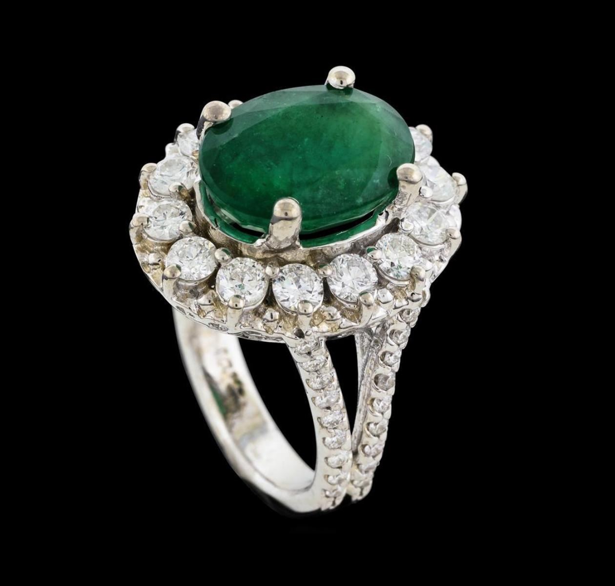 One electronically tested 14KT white gold lady's cast fashion ring with a split shank basket halo with a bright polish finish. The featured lady's ring has a double shank measuring 3.41 millimeters wide. Identified with markings of '14K'. Condition is new, good workmanship. Containing: One prong set oval modified mixed cut natural emerald, measuring 12.78 x 9.50 x 5.47mm, (depth est.) 15%. bulge factor, approximate weight of 4.70ct., clarity is heavily included, medium dark, moderately strong, green color, (GIA G 6/4), cut is good. Transmitting light somewhat diffusely, semi-transparent to translucent. Naturally occurring internal & external characteristics are present. Indications of oil residue. Colored gemstones are presumed to have been subjected to commonly used enhancement processes. Graded in the setting. Fourteen prong set round brilliant cut diamonds, measuring 3.00 - 2.90 x 1.83mm (depth est.) approximate total weight of 14 Stones = 1.35ct. Graded in the setting. Clarity SI-1 to I-1. Color: G - H Cut Good Thirty-Six prong set round brilliant cut diamonds, measuring 1.40 - 1.35 x 0.86mm (depth est.) approximate total weight of 36 Stones = 0.36ct. Graded in the setting. Clarity SI-1 to I-1. Color: G - H Cut Good. Total Weight of Colored Stones 4.70ct.. Total Weight of Diamonds 1.71ct.. Total Weight of Ring 9.10gm. GAS Appraised.