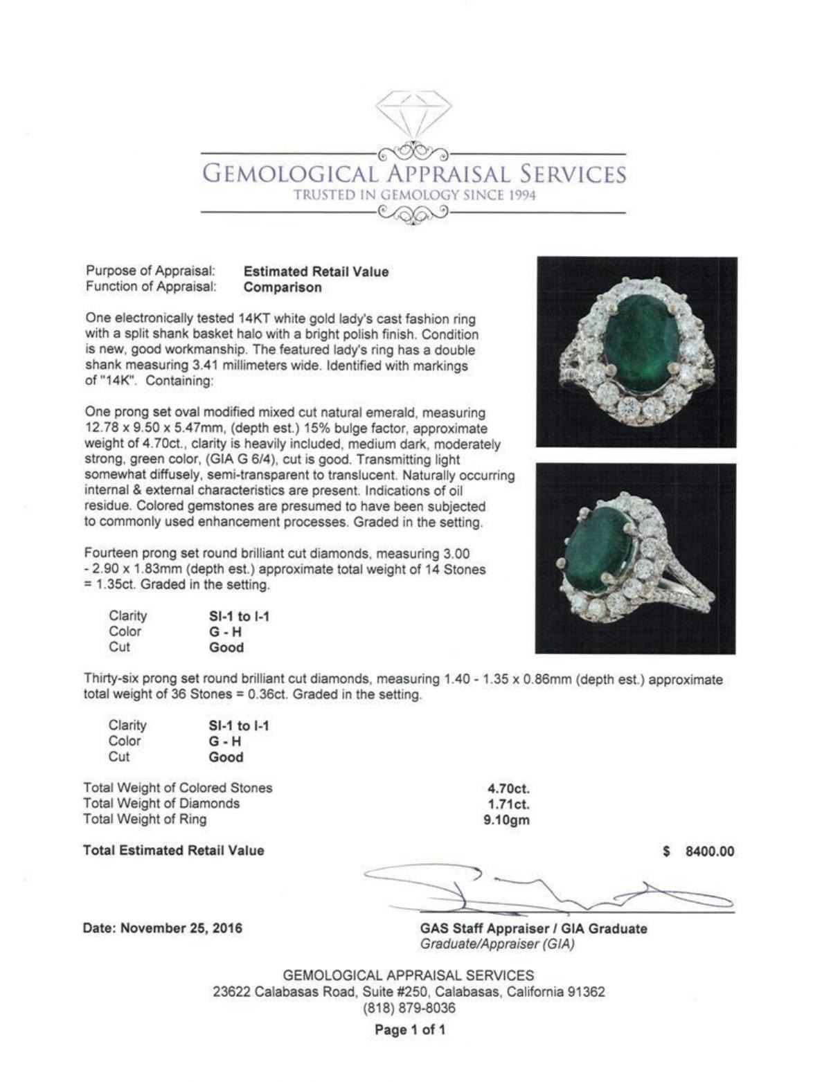 One electronically tested 14KT white gold lady's cast fashion ring with a split shank basket halo with a bright polish finish. The featured lady's ring has a double shank measuring 3.41 millimeters wide. Identified with markings of '14K'. Condition is new, good workmanship. Containing: One prong set oval modified mixed cut natural emerald, measuring 12.78 x 9.50 x 5.47mm, (depth est.) 15%. bulge factor, approximate weight of 4.70ct., clarity is heavily included, medium dark, moderately strong, green color, (GIA G 6/4), cut is good. Transmitting light somewhat diffusely, semi-transparent to translucent. Naturally occurring internal & external characteristics are present. Indications of oil residue. Colored gemstones are presumed to have been subjected to commonly used enhancement processes. Graded in the setting. Fourteen prong set round brilliant cut diamonds, measuring 3.00 - 2.90 x 1.83mm (depth est.) approximate total weight of 14 Stones = 1.35ct. Graded in the setting. Clarity SI-1 to I-1. Color: G - H Cut Good Thirty-Six prong set round brilliant cut diamonds, measuring 1.40 - 1.35 x 0.86mm (depth est.) approximate total weight of 36 Stones = 0.36ct. Graded in the setting. Clarity SI-1 to I-1. Color: G - H Cut Good. Total Weight of Colored Stones 4.70ct.. Total Weight of Diamonds 1.71ct.. Total Weight of Ring 9.10gm. GAS Appraised.
