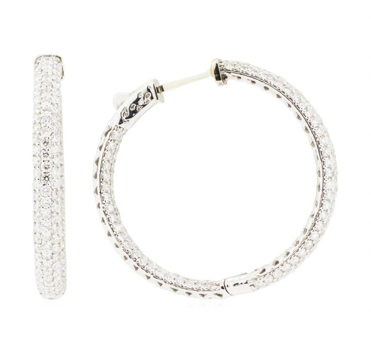One electronically tested 14KT white gold lady's combination cast & assembled fashion hoop inside / outside earrings with hinged, snap locking posts with a bright polish finish. The featured lady's inside / outside hoop earrings have a diameter measuring 38 millimeters. Identified with markings of '14K'. Condition is new, good workmanship. Containing: Three Hundred Four prong set round brilliant cut diamonds, measuring 1.70 - 1.55 x 0.96mm (depth est.) approximate total weight of 304 Stones = 4.70ct. Graded in the setting. Color G - I Clarity SI-1 to SI-2 Cut Very Good. Total Weight of Diamonds 4.70ct.. Total Weight of Inside / Outside Earrings 11.80gm GAS Appraised at $14960.00. GAS Appraised.