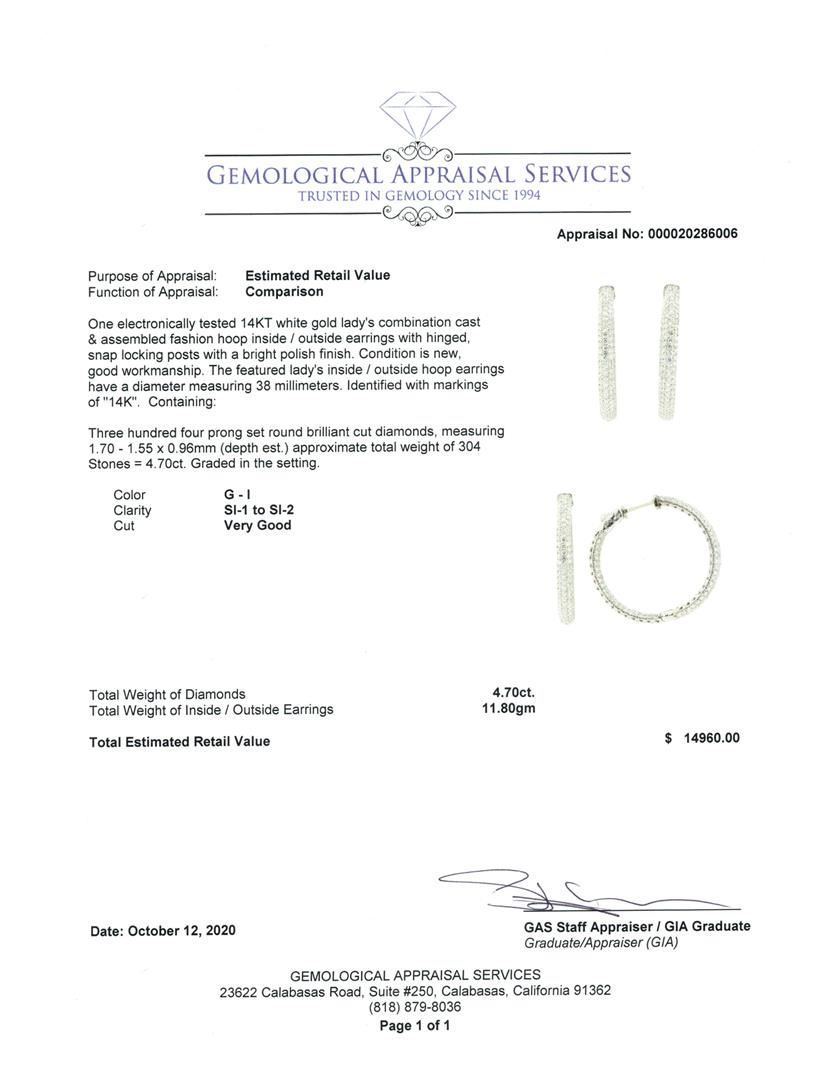 One electronically tested 14KT white gold lady's combination cast & assembled fashion hoop inside / outside earrings with hinged, snap locking posts with a bright polish finish. The featured lady's inside / outside hoop earrings have a diameter measuring 38 millimeters. Identified with markings of '14K'. Condition is new, good workmanship. Containing: Three Hundred Four prong set round brilliant cut diamonds, measuring 1.70 - 1.55 x 0.96mm (depth est.) approximate total weight of 304 Stones = 4.70ct. Graded in the setting. Color G - I Clarity SI-1 to SI-2 Cut Very Good. Total Weight of Diamonds 4.70ct.. Total Weight of Inside / Outside Earrings 11.80gm GAS Appraised at $14960.00. GAS Appraised.