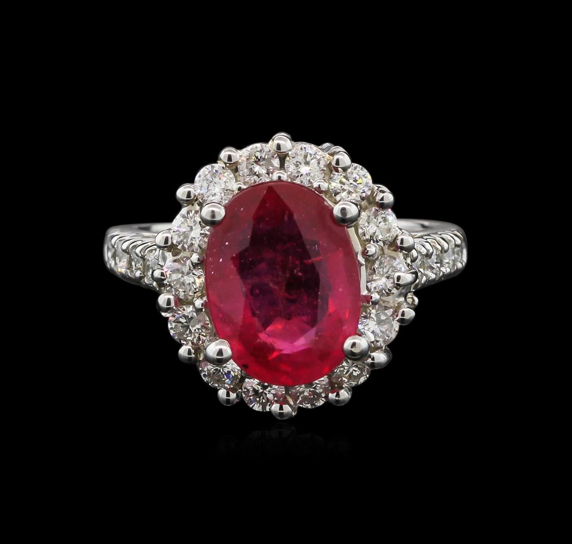 One electronically tested 14KT white gold ladies cast ruby and diamond ring with a bright polish finish. The featured ruby is set within a diamond bezel supported by diamond set shoulders, completed by a one and one-half millimeter wide band. Identified with markings of "14K". Condition is new, good workmanship. Containing: One prong set oval mixed cut natural ruby exact weight 4.70ct., clarity is heavily included, type II, medium dark, very slightly brownish, red color, (GIA R 6/3), cut is good. Transmitting light somewhat diffusely, transparent to translucent. Naturally occurring internal & external characteristics are present. Indications of laboratory high temperature heat treatment, with glass & flux additives. Graded in the setting. Ruby has a low tolerance to rhodium plating, repolishing the surface, & ultrasonic cleaning. Twenty-Two prong set round brilliant cut diamonds exact total weight 22 Stones = 1.00ct. Graded in the setting. Clarity: SI-2 to I-1. Color: G - I. Total Weight of Colored Stones 4.70ct. Total Weight of Diamonds 1.00ct. Total Weight of Ring 7.12gm. AIG Appraised at $4,710.00.