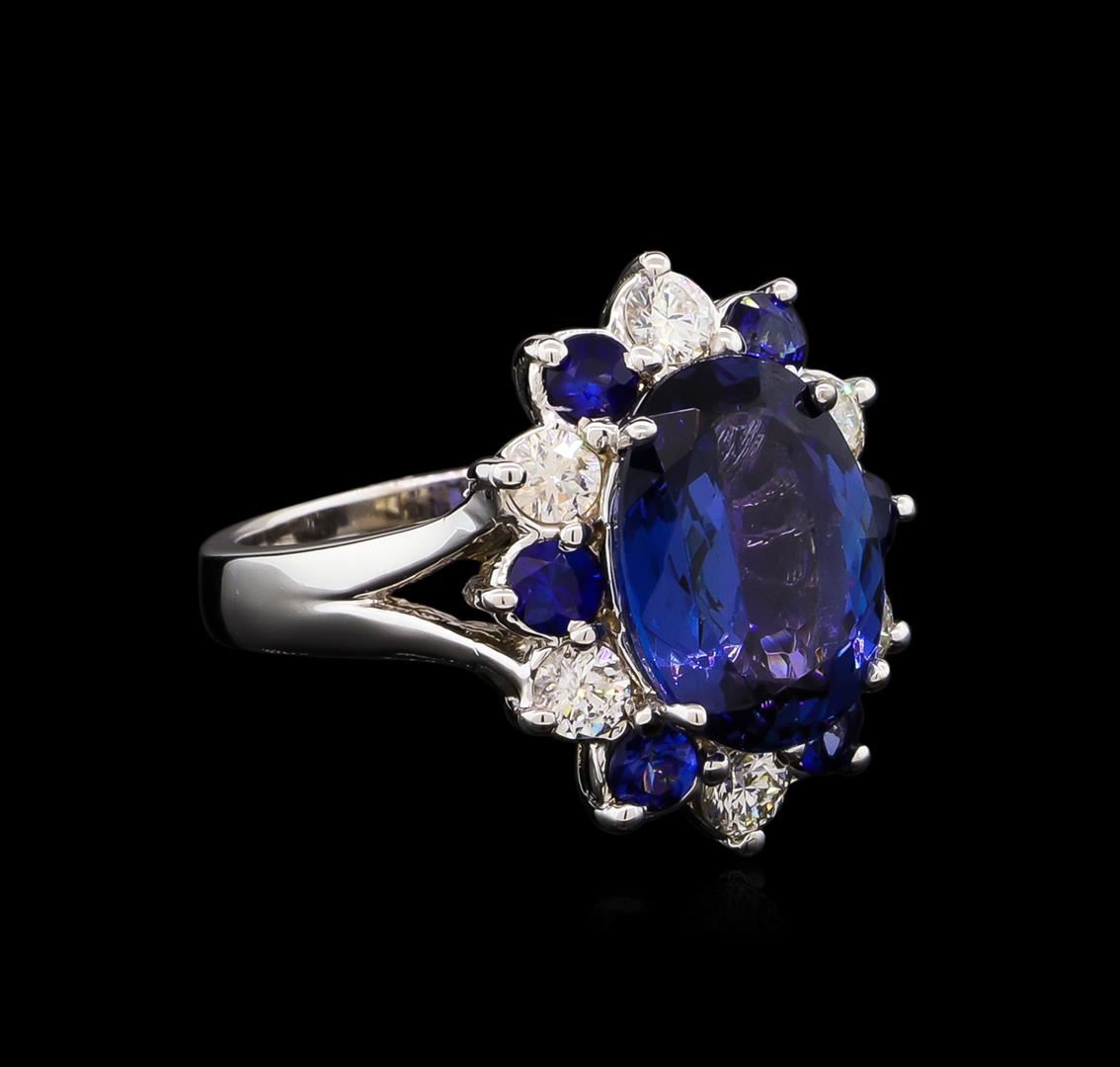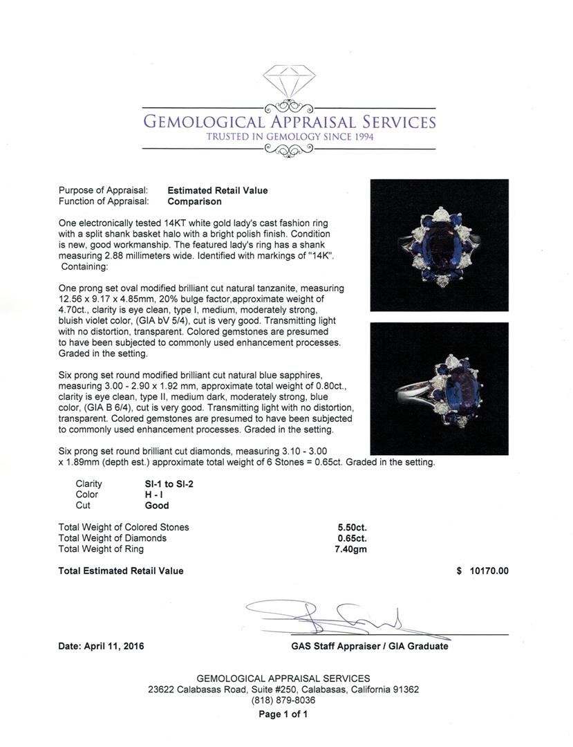 One electronically tested 14KT white gold lady's cast fashion ring with a split shank basket halo with a bright polish finish. The featured lady's ring has a shank measuring 2.88 millimeters wide. Identified with markings of "14K". Condition is new, good workmanship. Containing: One prong set oval modified brilliant cut natural tanzanite, measuring 12.56 x 9.17 x 4.85mm, 20%. bulge factor, approximate weight of 4.70ct., clarity is eye clean, type I, medium, moderately strong, bluish violet color, (GIA bV 5/4), cut is very good. Transmitting light with no distortion, transparent. Colored gemstones are presumed to have been subjected to commonly used enhancement processes. Graded in the setting. Six prong set round modified brilliant cut natural blue sapphires, measuring 3.00 - 2.90 x 1.92 mm, approximate total weight of 0.80ct., clarity is eye clean, type II, medium dark, moderately strong, blue color, (GIA B 6/4), cut is very good. Transmitting light with no distortion, transparent. Colored gemstones are presumed to have been subjected to commonly used enhancement processes. Graded in the setting. Six prong set round brilliant cut diamonds, measuring 3.10 - 3.00 x 1.89mm (depth est.) approximate total weight of 6 Stones = 0.65ct. Graded in the setting. Clarity: SI-1 to SI-2. Color: H - I. Cut Good. Total Weight of Colored Stones 5.50ct. Total Weight of Diamonds 0.65ct. Total Weight of Ring 7.40gm. GAS Appraised at $10,170.00.