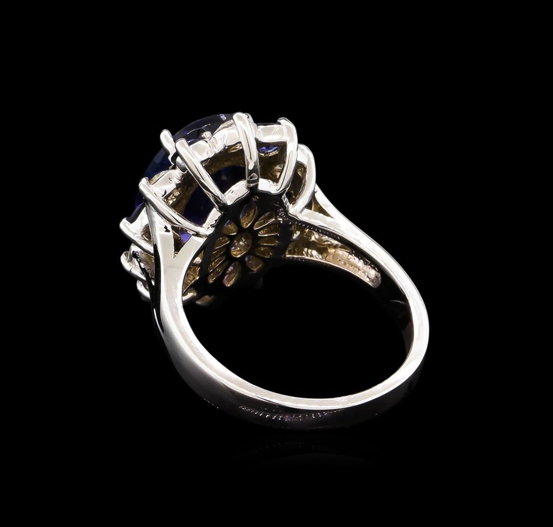 One electronically tested 14KT white gold lady's cast fashion ring with a split shank basket halo with a bright polish finish. The featured lady's ring has a shank measuring 2.88 millimeters wide. Identified with markings of "14K". Condition is new, good workmanship. Containing: One prong set oval modified brilliant cut natural tanzanite, measuring 12.56 x 9.17 x 4.85mm, 20%. bulge factor, approximate weight of 4.70ct., clarity is eye clean, type I, medium, moderately strong, bluish violet color, (GIA bV 5/4), cut is very good. Transmitting light with no distortion, transparent. Colored gemstones are presumed to have been subjected to commonly used enhancement processes. Graded in the setting. Six prong set round modified brilliant cut natural blue sapphires, measuring 3.00 - 2.90 x 1.92 mm, approximate total weight of 0.80ct., clarity is eye clean, type II, medium dark, moderately strong, blue color, (GIA B 6/4), cut is very good. Transmitting light with no distortion, transparent. Colored gemstones are presumed to have been subjected to commonly used enhancement processes. Graded in the setting. Six prong set round brilliant cut diamonds, measuring 3.10 - 3.00 x 1.89mm (depth est.) approximate total weight of 6 Stones = 0.65ct. Graded in the setting. Clarity: SI-1 to SI-2. Color: H - I. Cut Good. Total Weight of Colored Stones 5.50ct. Total Weight of Diamonds 0.65ct. Total Weight of Ring 7.40gm. GAS Appraised at $10,170.00.
