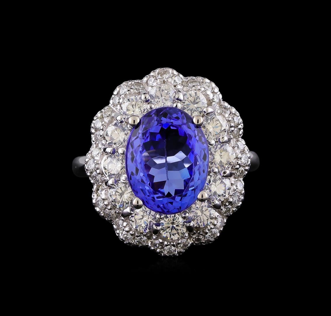 One electronically tested 14KT white gold lady's cast fashion ring with a scallop double basket halo with a bright polish finish. The featured lady's has a shank measuring 2.22 millimeters in width. Identified with markings of "K14". Condition is new, good workmanship. Containing: One prong set oval modified brilliant cut natural tanzanite, measuring 11.18 x 8.71 x 5.91mm, (depth est.) 15%. bulge factor, approximate weight of 4.70ct., clarity is eye clean, medium, moderately strong, bluish violet color, (GIA bV 5/4), cut is very good. Transmitting light with no distortion, transparent. Colored gemstones are presumed to have been subjected to commonly used enhancement processes. Graded in the setting. Twelve prong set round brilliant cut diamonds, measuring 3.05 - 3.00 x 1.88mm (depth est.) approximate total weight of 12 Stones = 1.25ct. Graded in the setting. Clarity: VS-2 to SI-1. Color: H - I. Cut Very Good Thirty-Six prong set round brilliant cut diamonds, measuring 1.40 - 1.35 x 0.86mm (depth est.) approximate total weight of 36 Stones = 0.37ct. Graded in the setting. Clarity: SI-1 to SI-2. Color: G - Good. Total Weight of Colored Stones 4.70ct. Total Weight of Diamonds 1.62ct. Total Weight of Ring 8.00gm. GAS Appraised.