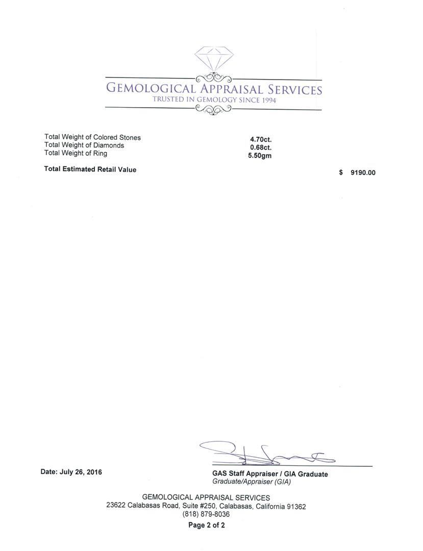 Not all Jewelry, watches or loose stones are appraised and the appraisals are provided for bidders only in certain instances at the discretion of SAA. Our appraisals are conducted by independent third-party appraisal firms. Such firms may be certified GIA Gemologists or have education in the industry or alternative certifications. Appraisals should be used for verification of gemstone and/or metal weight, size, and grade only, not actual value for resale or insurance purposes. Appraisal value should be not considered for actual value, as price varies greatly from retail locations and other merchants in different geographic locations. All Items auctioned by SAA should not be purchased with a view or expectation toward resale for appraisal price given, or to make a profit. The ultimate value for which an item can be resold may vary drastically from the appraisals listed by SAA.