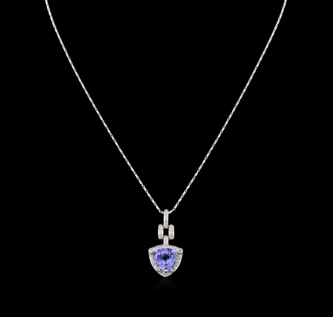 Fourteen karat (14K) white gold tanzanite and diamond pendant. A trillion cut tanzanite zoisite gemstone is prong mounted in the center of the pendant. Round brilliant cut diamonds accent the pendant around the center gemstone and on the top bail. The pendant is cast stamped "14K" and has a gross weight of 8.3 Grams. Diamond(s): Shape: Round Brilliant cut. Weight: 0.40 carat. Average Clarity: I1. Average Color: H-J. Symmetry: Very Good. Polish: Very Good. Gemstone(s): Gemstone: Tanzanite Zoisite. Nature: Natural. Shape: Trillion, Faceted. Quantity: 1, Mounted. Weight: 4.71 carat. Dimensions: Length- 10.40 mm. ; Width- 9.79 mm. Bulge: Visible. Clarity: VS, Type 1. Color: Purplish Blue (4/4). Symmetry: Very Good. Color Intensity: Medium. Transparency: Transparent. Tone: Medium. Metal(s): Metal: Gold, Stamped. Purity: 14K. Color: White. Condition: Excellent. Finish: High polish. GGA Appraised at $13,185.00.